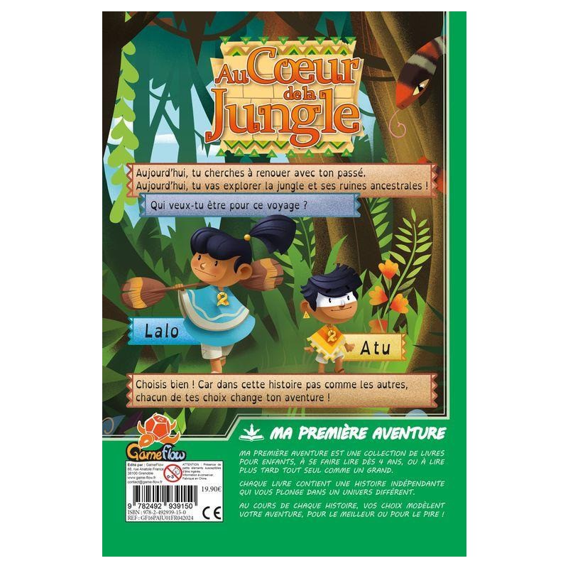 Entre dans la jungle de tes ancêtres à la recherche de la mystérieuse Pierre de Jade et découvre tes origines. Qui souhaites-tu incarner : Lalo la grande sœur ou Atu le petit frère ? Maintenant, ton aventure peut commencer. Tu vas pouvoir lire ce livre normalement, de gauche à droite, mais rapidement, tu feras face à des choix matérialisés par des pages coupées en trois. Tourne la partie de ton choix et découvre ce qui va se passer. Après plusieurs choix, tu arriveras à la fin de ton aventure… Réussiras-tu à retrouver la pierre légendaire et à ouvrir les portes du passé ? Une fois la lecture terminée, tu peux recommencer pour découvrir de nouveaux chemins eou essayer avec un autre personnage.