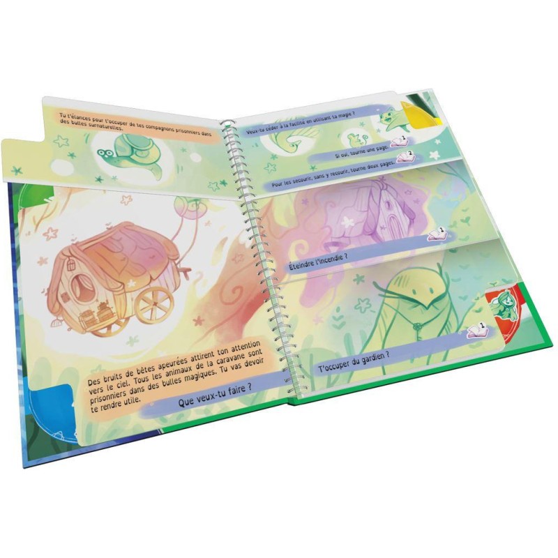 Crée ta propre histoire : à chaque page coupée en trois, tu devras faire un choix. Ouvre le livre et choisis-le magicien ou la magicienne que tu souhaites incarner : Lilon l’elfe des airs, qui vole et soigne toutes les misères ? Camille l’ensorceleuse, maîtresse des glaces pas frileuse ? Lucien le pyromancien, qui dompte les flammes au quotidien ? Maintenant, ton aventure peut commencer. Tu vas pouvoir lire ce livre normalement, de gauche à droite, mais rapidement, tu feras face à des choix matérialisés par des pages coupées en trois. Tourne la partie de ton choix et découvre ce qui va se passer. Après plusieurs choix, tu arriveras à la fin de ton aventure… Réussiras-tu à récupérer le Livre du Savoir de ton peuple ? Une fois la lecture terminée, tu peux recommencer pour découvrir de nouveaux chemins et/ou essayer avec un autre personnage.