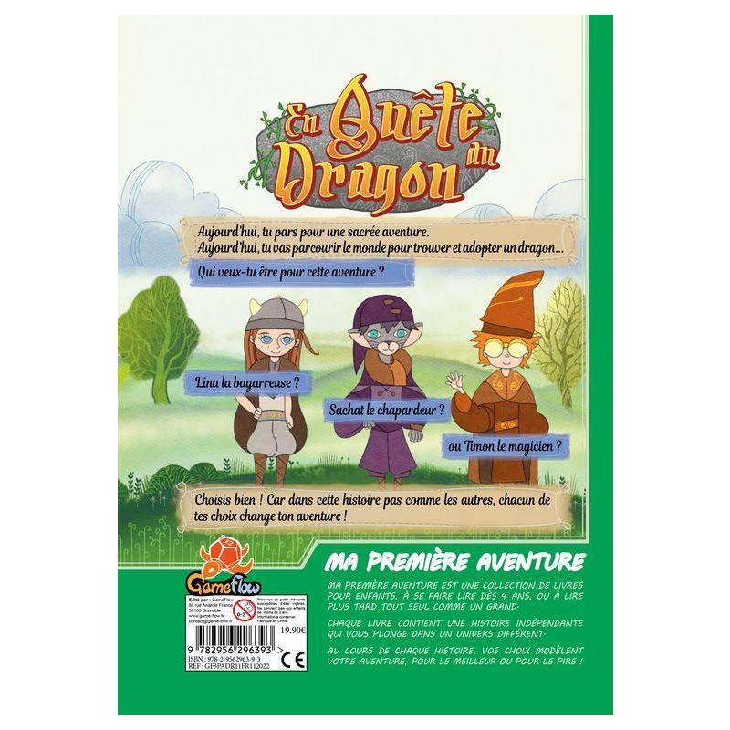 Tu as toujours rêvé d’être un héros ? La gamme Ma première aventure t’offre cette opportunité. Ouvre le livre choisi un personnage et construit ton histoire en faisant des choix matérialisés par des pages coupées en 3. Dans Ma première aventure en quête du Dragon, tu devras choisir entre Lina la bagarreuse, Timon le magicien ou Sacha le chat-pardeur pour mener à bien ta mission qui est de trouver et d'adopter un dragon.