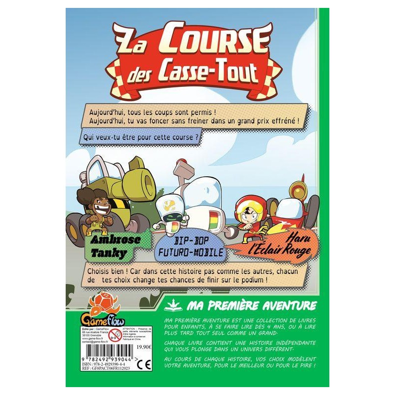 Tu as toujours rêvé d’être un héros ? La gamme Ma première aventure t’offre cette opportunité. Ouvre le livre choisi un personnage et construit ton histoire en faisant des choix matérialisés par des pages coupées en 3. Dans Ma première aventure : la course casse-tout, te voilà engagé dans une course de bolides où tous les coups seront permis. Quel héros a le plus de chance de gagner ? Ambrose à bord de Tanky, son char blindé ? Bip-Bop dans sa Futuro-Mobile, la merveille technologique ? Ou Haru et son Éclair Rouge, le super bolide ?