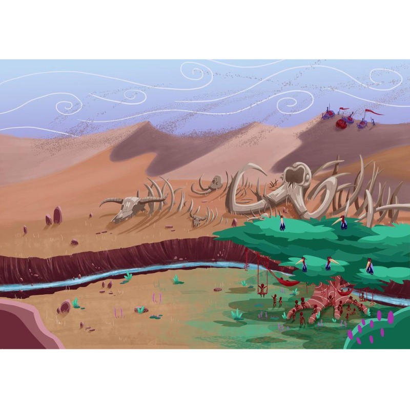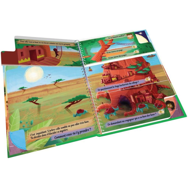 Crée ta propre histoire : à chaque page coupée en trois, tu devras faire un choix. Ouvre le livre et choisis ton personnage : Maïlune, la chasseuse courageuse ? Issa sa soeur, gentille et bavarde ? Ou Sumai, leur petit frère cueilleur ? Maintenant, ton aventure peut commencer. Tu vas pouvoir lire ce livre normalement, de gauche à droite, mais rapidement, tu feras face à des choix matérialisés par des pages coupées en trois. Tourne la partie de ton choix et découvre ce qui va se passer. Après plusieurs choix, tu arriveras à la fin de ta quête… Réussiras-tu à trouver la cause de la grande sécheresse ? Une fois la lecture terminée, tu peux recommencer pour découvrir de nouveaux chemins et/ou essayer avec un autre personnage.