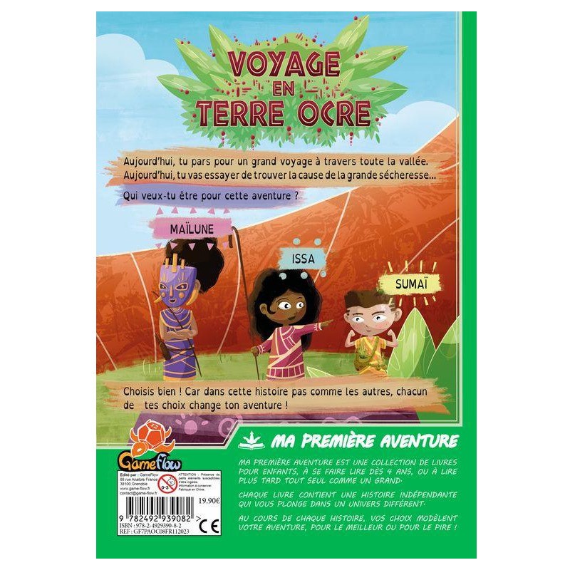 Tu as toujours rêvé d’être un héros ? La gamme Ma première aventure t’offre cette opportunité. Ouvre le livre choisi un personnage et construit ton histoire en faisant des choix matérialisés par des pages coupées en 3. Dans Ma première aventure : voyage en terre ocre, sauras-tu trouver les raisons de la grande sécheresse ? Une long voyage dans la vallée dans la peau de Maïlune, la chasseuse courageuse, d’Issa sa soeur, gentille et bavarde ou de Sumai, leur petit frère cueilleur ? À toi de faire ton choix.