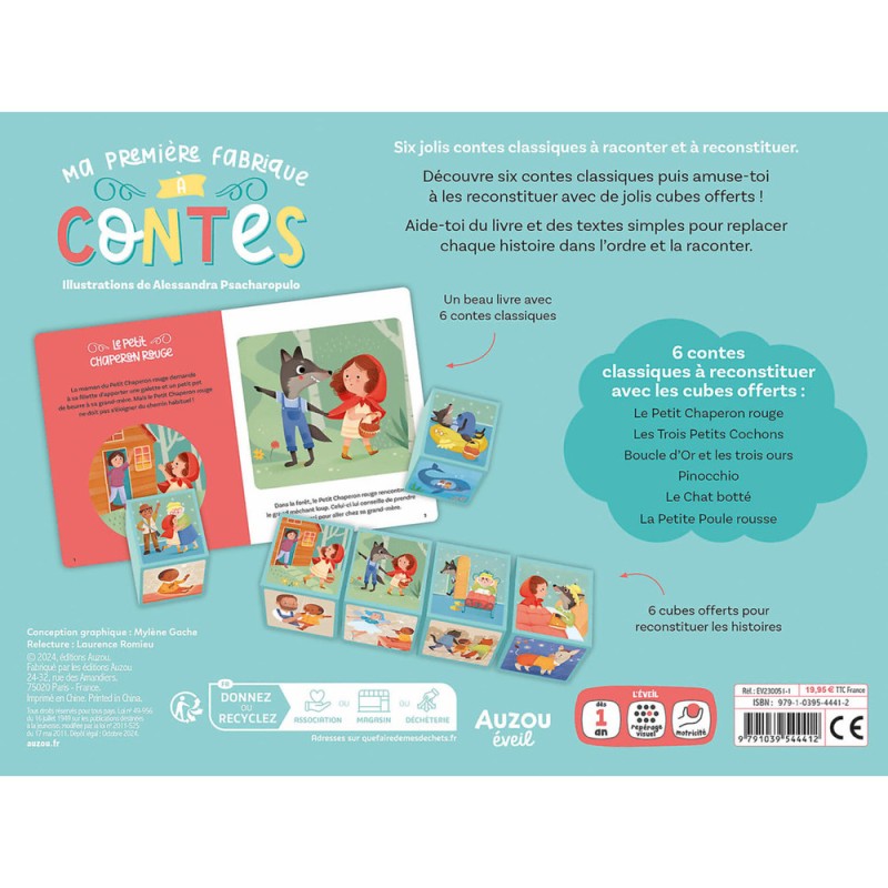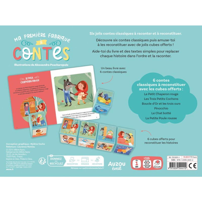 Un coffret pour connaitre 6 contes célèbres et aider les enfants à appréhender le repérage dans le temps ! Un coffret contenant : - un livre avec 6 contes connus - 6 cubes illustrés pour reconstruire les histoires L'enfant lit l'histoire avec son parent puis reconstruit les différentes étapes de l'histoire avec les cubes.