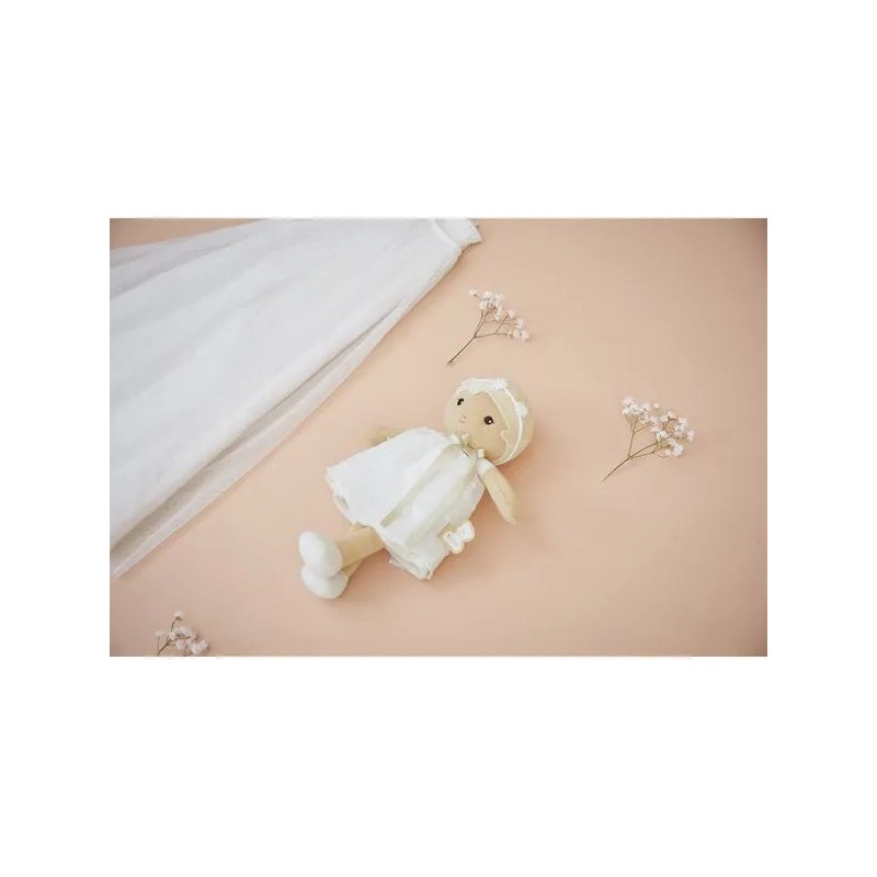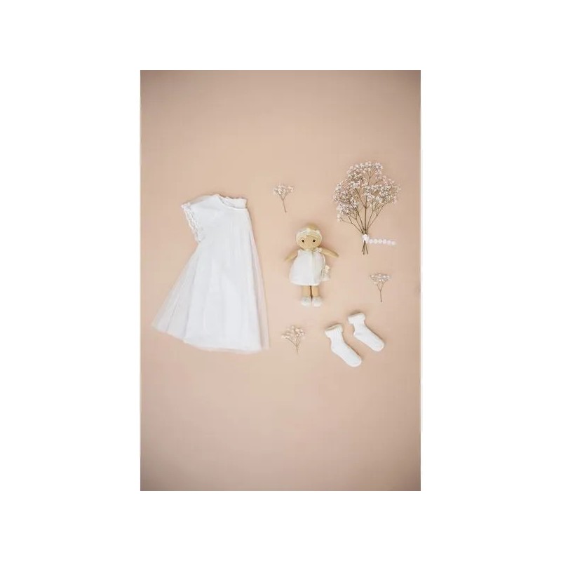 Son chignon joliment relevé apporte une touche distinguée et ses souliers assortis viennent parfaire son allure raffinée et élégante. Daphné est une poupée qui reflète la pureté et la douceur des instants précieux. Sa tenue aérienne est sublimée par une délicate couronne de fleurs, telle une touche finale de poésie.