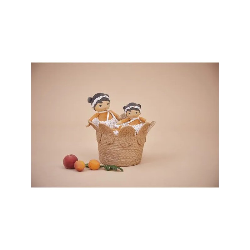 La poupée Éloïse porte également une sublime jupe en velours côtelé et mousseline parée de motifs fruités, rappelant la douceur des beaux jours et les plaisirs des récoltes sous le soleil. Un délicat bandeau, assorti à sa jupe, vient souligner ses doubles chignons, renforçant son allure joyeuse et pétillante !
