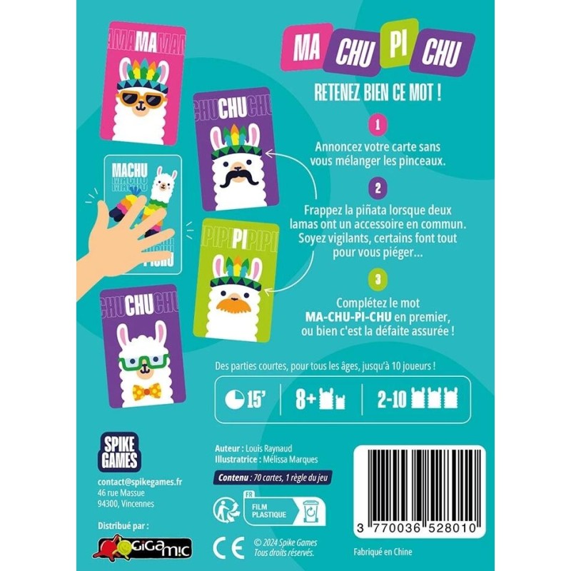 Mais ce n'est pas tout ! Lorsque vous retournez une carte, annoncez le mot écrit dessus. Si une séquence Ma-Chu-Pi se forme, frappez immédiatement la piñata en criant ""Chu"" pour terminer le mot. Le dernier récupère toutes les cartes des autres...