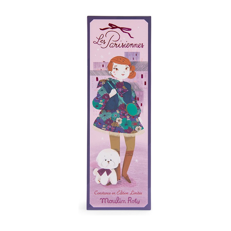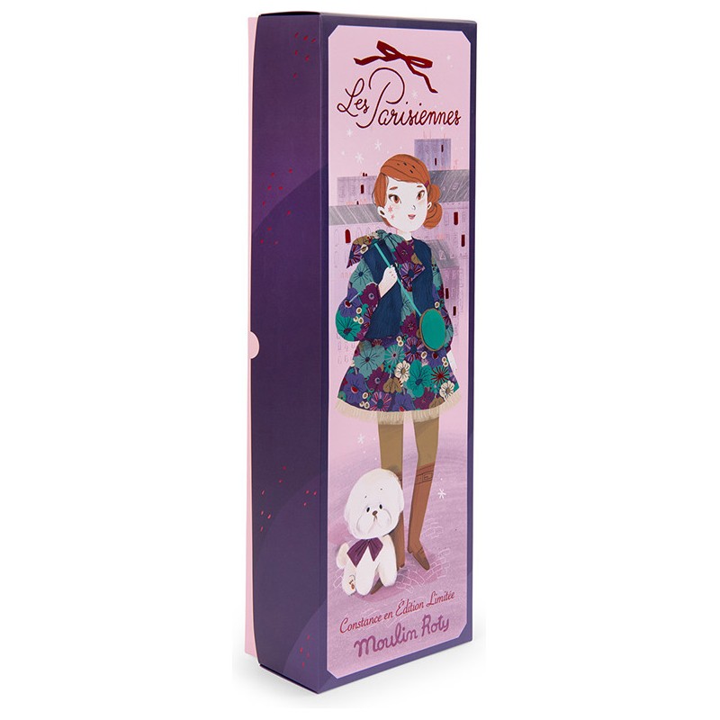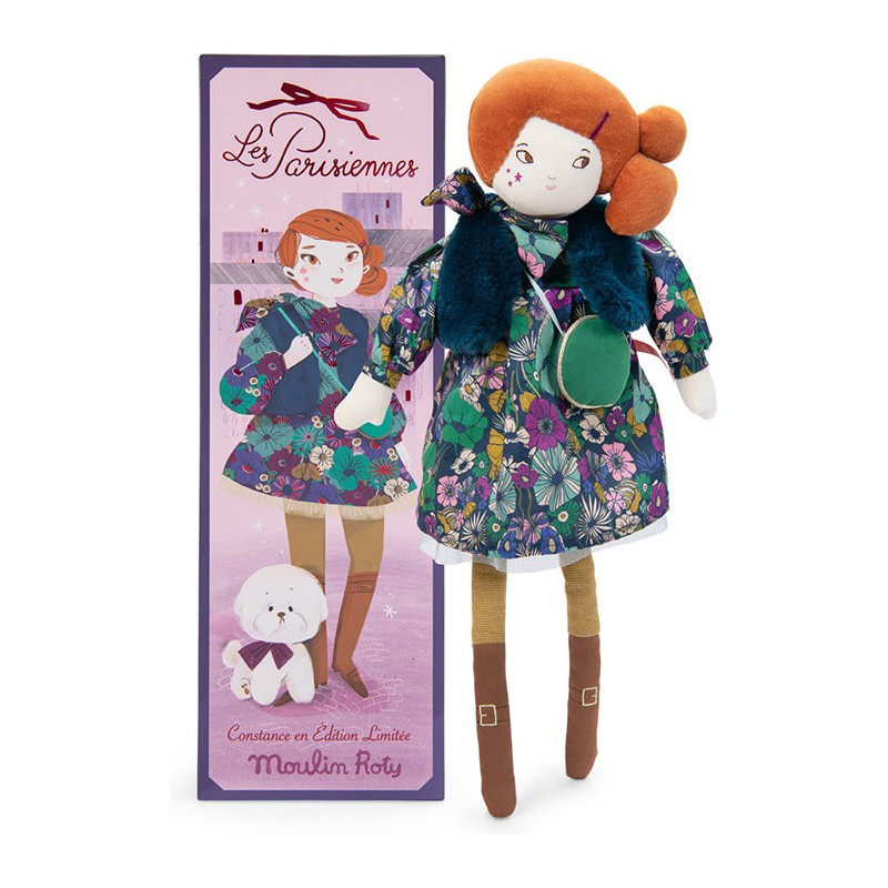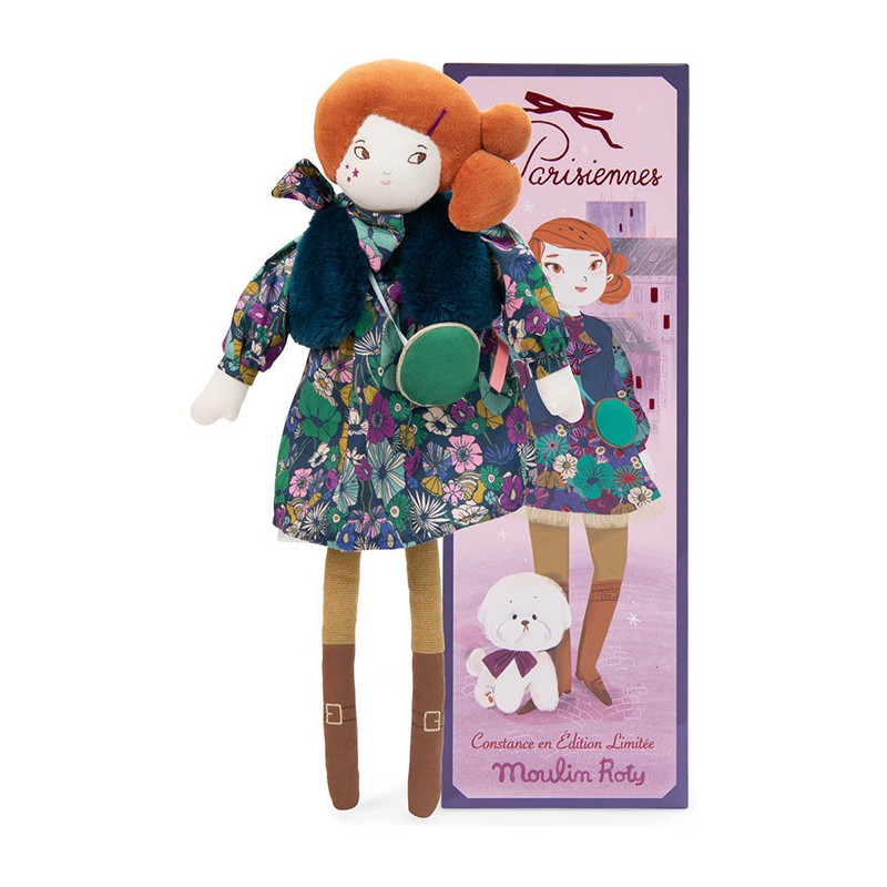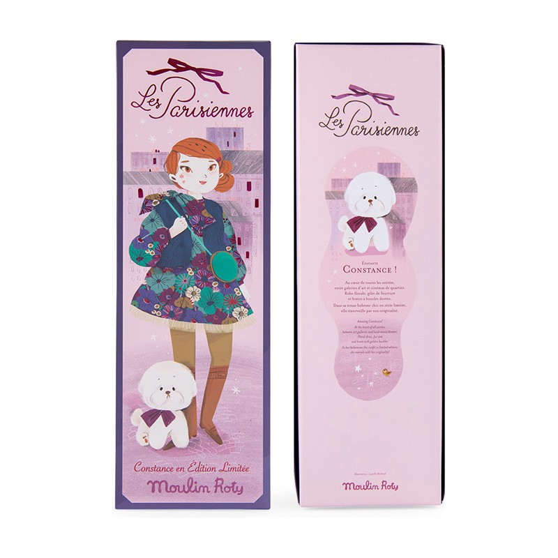 Épatante Constance en édition limitée ! Robe fleurie, gilet de fourrure et bottes à boucles dorées, elle émerveille par son originalité. Poupée Les Parisiennes au doux visage brodé et sérigraphié, présentée dans un coffret illustré par Lucille Michieli.