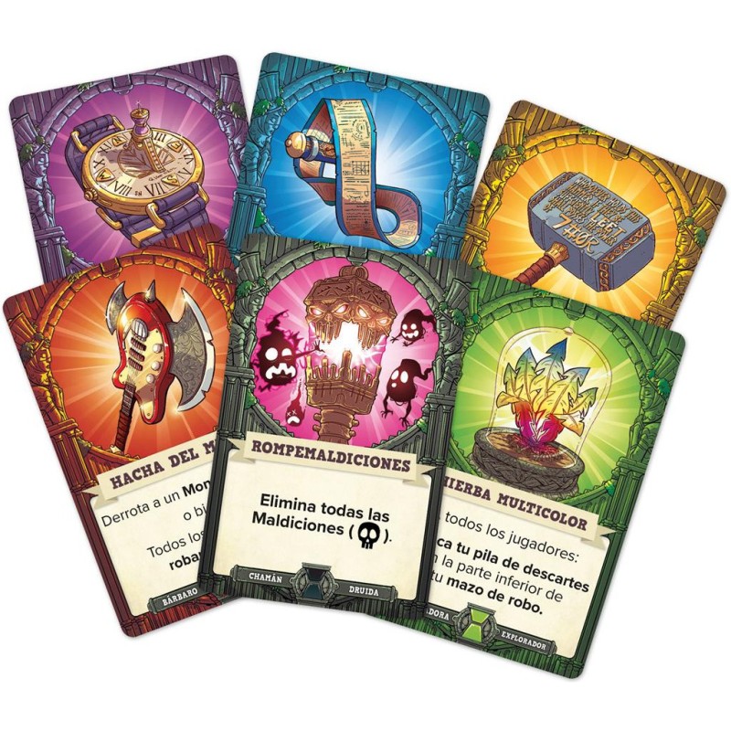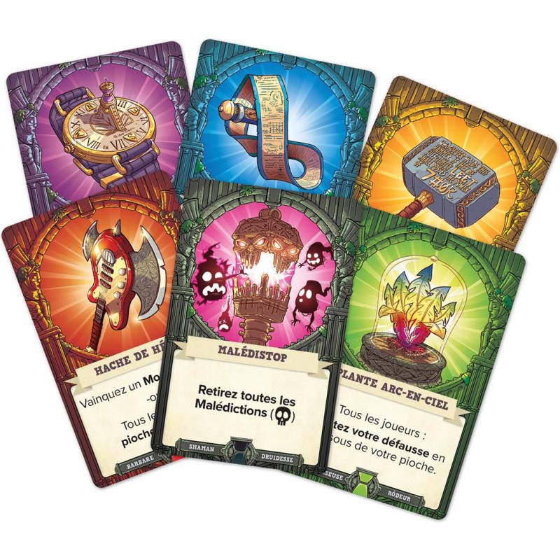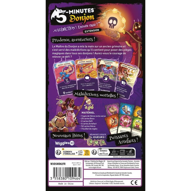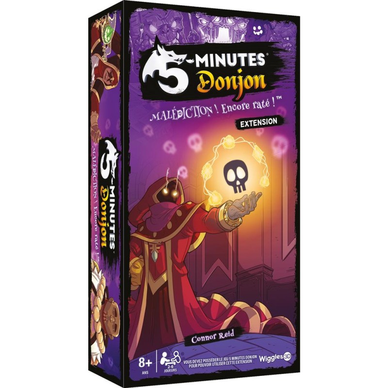 Le Maître du Donjon a mis la main sur un ancien grimoire et s’est servi des malédictions qu’il contient pour poser des pièges magiques dans tous ses donjons ! Aurez-vous le courage de relever ce défi ? Malédiction ! Encore raté ! est une extension pour 5 Minutes : Donjon qui ajoute des cartes Boss au Donjon, deux nouveaux personnages (la Druidesse et le Shaman), ainsi que de puissants Artefacts pour aider l’équipe à surmonter des situations délicates. Nécessite la boîte de base 5 minutes Donjon. Contenu