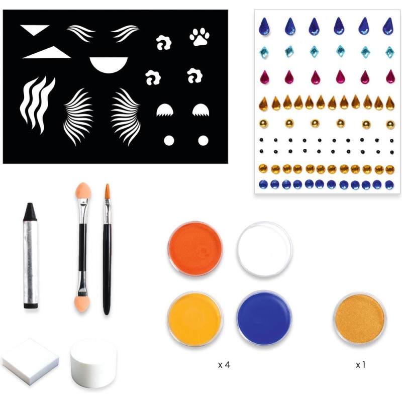Contenu : 4 fards gras 1 fard à paupière métallisé 1 crayon 1 pinceau 2 mousses 1 pinceau ombreur double embout 1 planche de pochoirs de peau Environ 40 perles et strass adhésifs pour la peau 1 livret explicatif avec les pas à pas pour réaliser 3 modèles