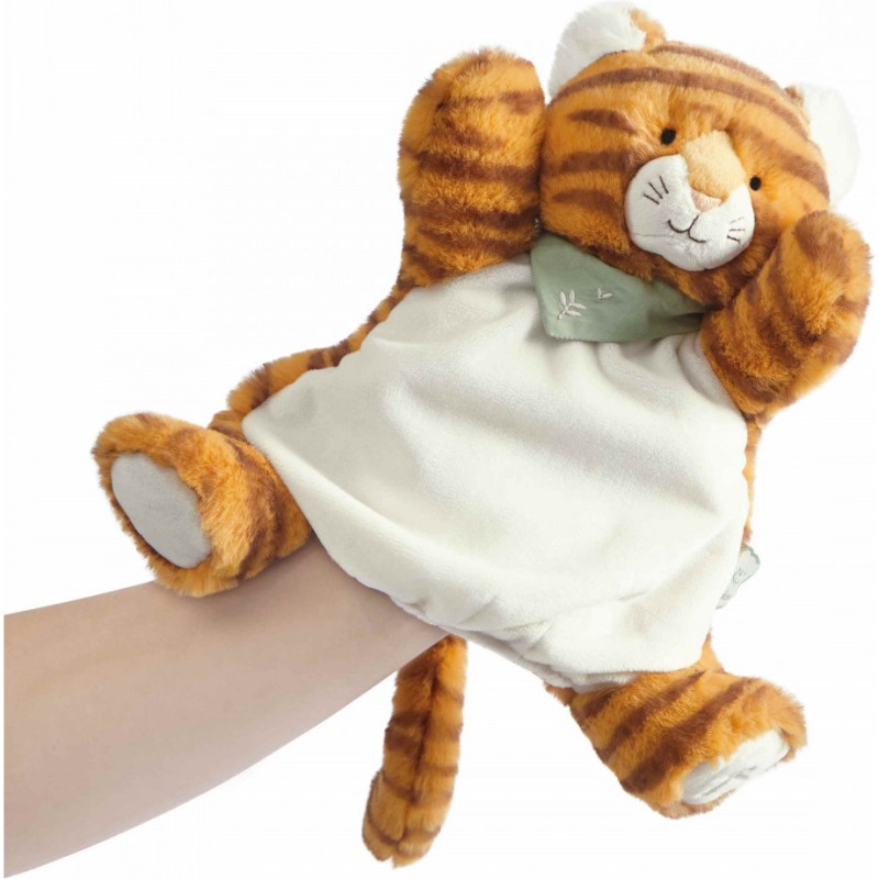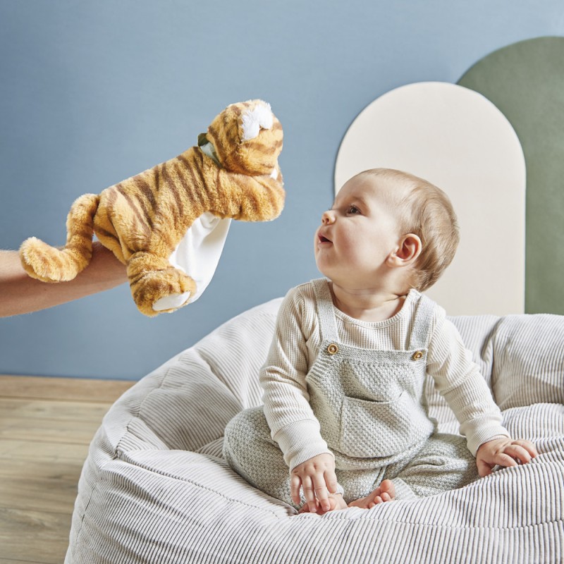 Bientôt disponible : rendez-vous le 4 avril ! Bébé va craquer pour sa peluche marionnette tigre ! Cet adorable tigreau se prénomme Papaye, et nous sommes certains qu'il sera un partenaire de jeu idéal pour les tout-petits, dès leur naissance. Avec ses rayures contrastées et sa bonne bouille, on ne se lasse pas de le cajoler et de lui faire des sourires !