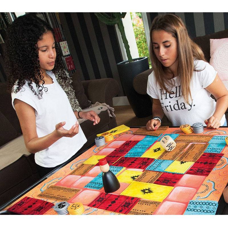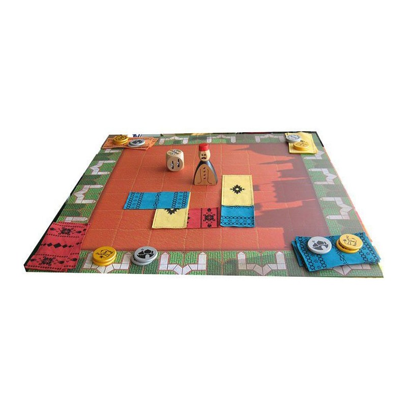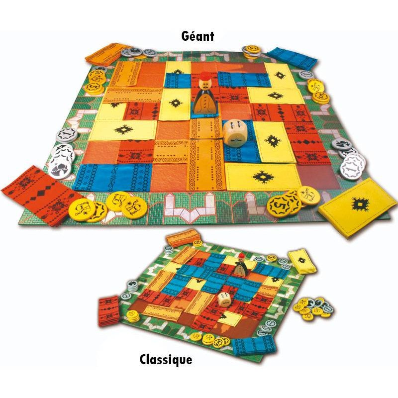Attention où vous posez vos babouches ! Le souk est en ébullition: c'est le grand jour du marché aux tapis! Le plus habile des marchands sera bientôt désigné! Chaque joueur est un marchand qui essaie de supplanter les autres. A tour de rôle, chacun lance le dé puis déplace Assam, l'organisateur de la vente. Si Assam s'arrête sur un tapis adverse, le marchand doit payer une dîme à son propriétaire avant de poser un de ses tapis sur un espace adjacent. Quand le dernier tapis est posé, on totalise les tapis visibles et la somme détenue par chacun des marchands: le meilleur l'emporte!