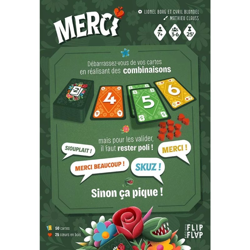 Merci est un jeu de politesse... qui ne manque pas de piquant ! Le but est de vous débarrasser de vos cartes en déclenchant des effets qui forcent vos adversaires à en récupérer, tout en leur imposant de vous dire "Merci". Mais attention, si quelqu'un oublie de montrer de la gratitude, il pourrait bien le regretter !