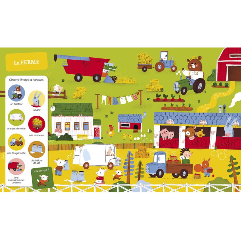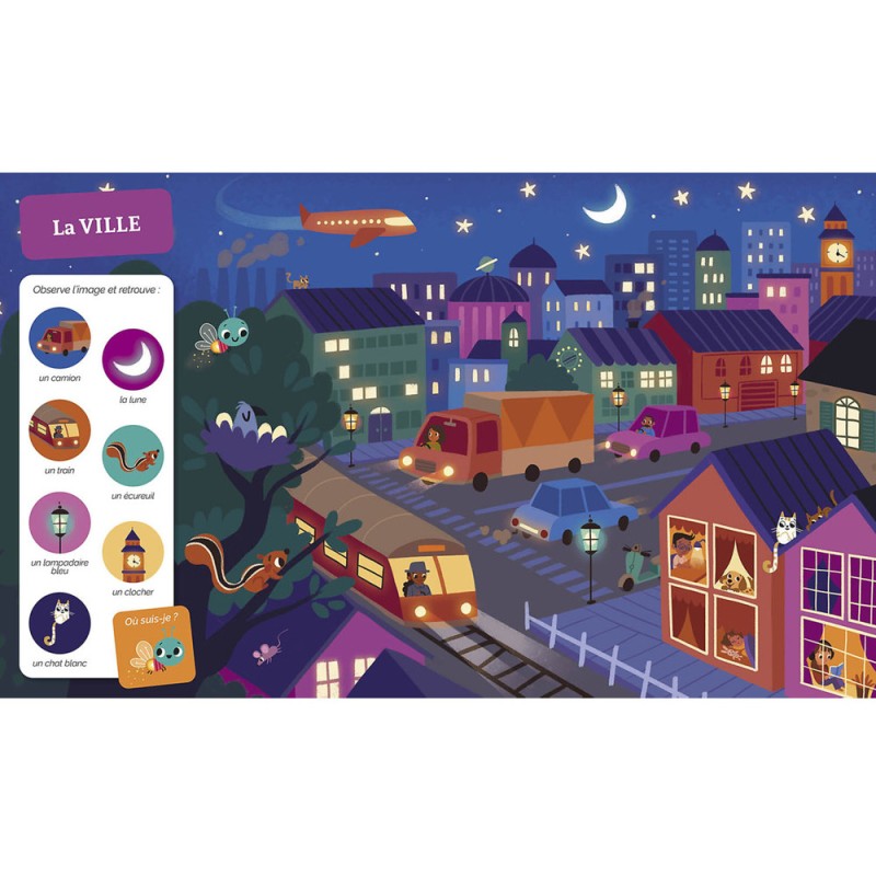 À travers 20 planches foisonnantes de détails, les petits partent à l’exploration de multiples univers ! Ils observent attentivement et retrouvent 7 éléments (+ la mascotte) bien cachés sur chaque planche.
