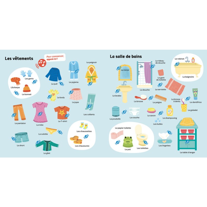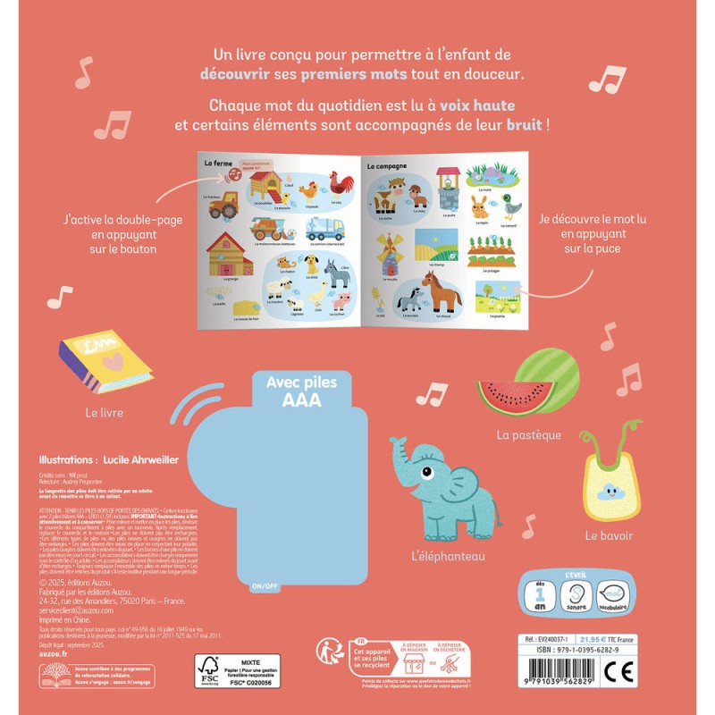 Avec son format adapté aux tout-petits, l'enfant découvre en douceur ses premiers mots. Chaque mot du quotidien est lu à voix haute et 50 d’entre eux sont accompagnés de leur bruit ! Les 500 mots sont regroupés en univers simples et adaptés aux plus petits (corps, maison, repas, saisons, couleurs et formes, etc). L’imagier est un incontournable dans les premières lectures de bébé : cela permet de montrer, nommer et reconnaître les éléments de leur quotidien.