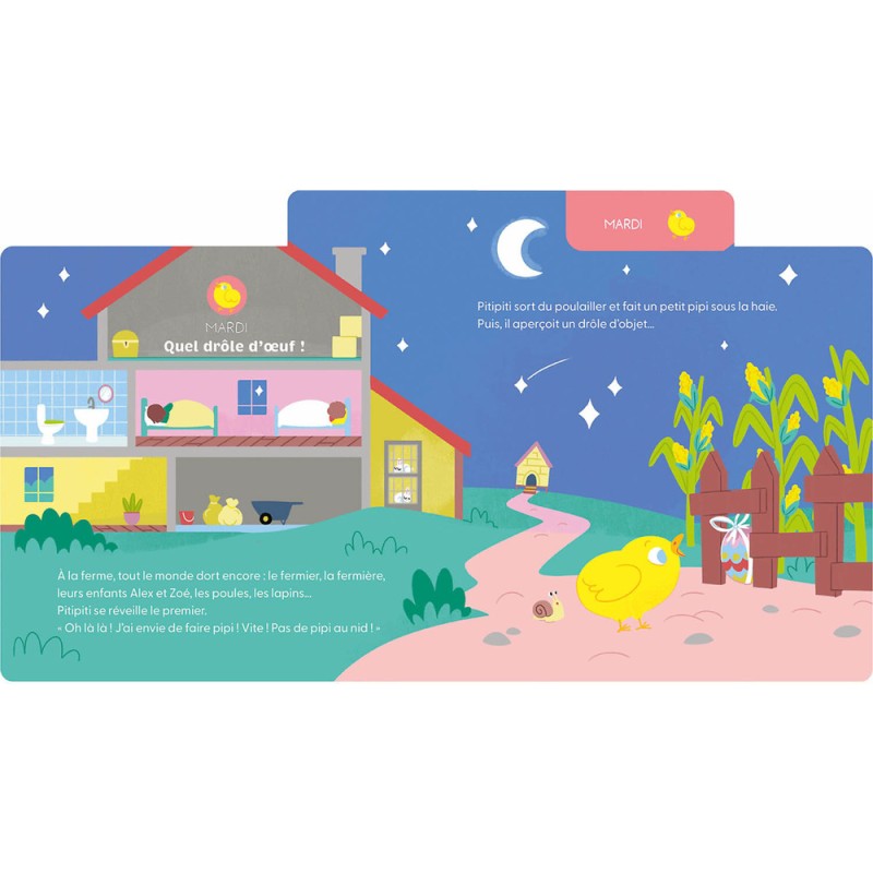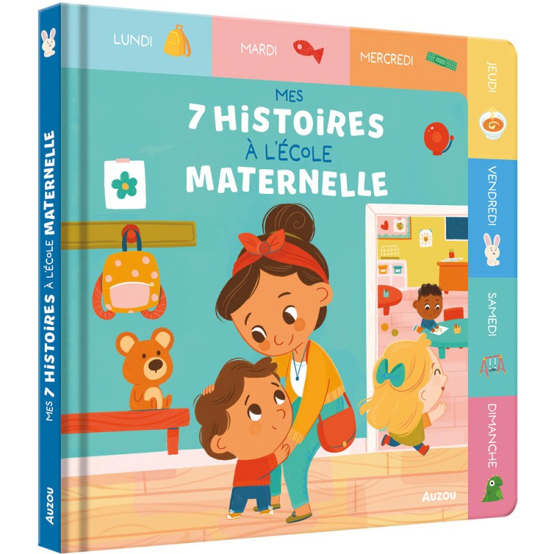 Découvre l'école maternelle avec 7 histoires : une pour chaque jour de la semaine ! Retrouve 7 personnages attachants dans de petites histoires courtes du soir qui raconte les petits tracas du quotidien. Avec ses 7 onglets, l'enfant apprend à se repérer dans le temps et à identifier les jours de la semaine. Un livre incontournable pour préparer à sa première rentrée !