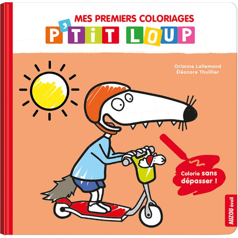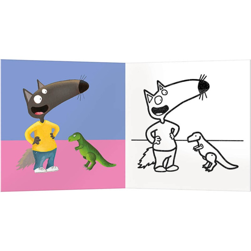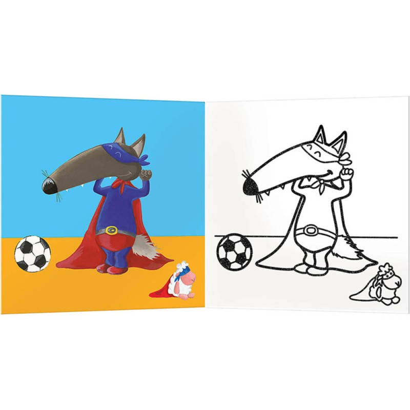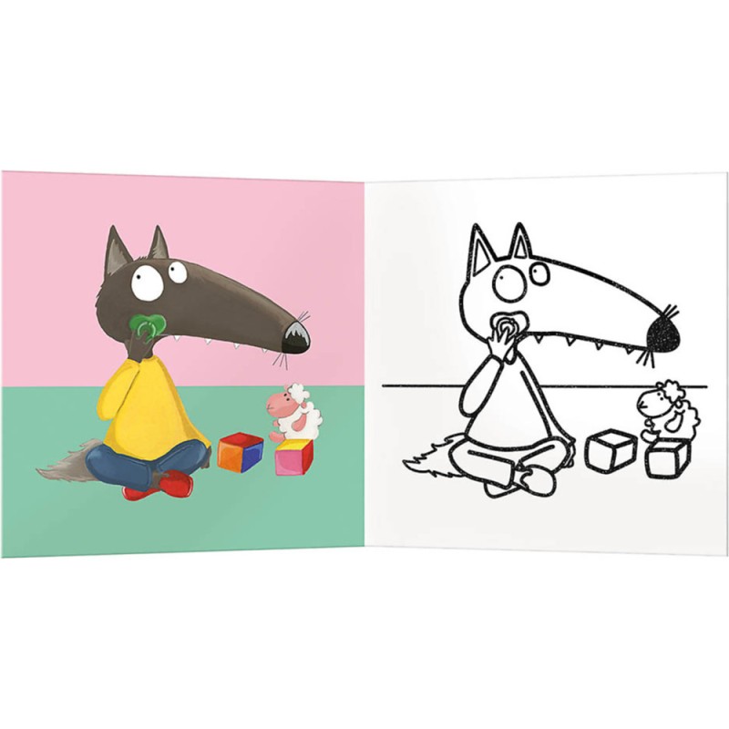 Sur chaque double page, l'enfant doit colorier une illustration simple de P'tit Loup avec ses jouets : trottinette, cerf-volant, robot, doudou,... Les contours avec du vernis pailleté permettent à l'enfant de colorier sans dépasser.
