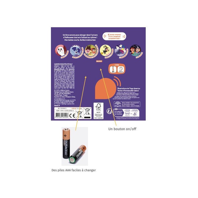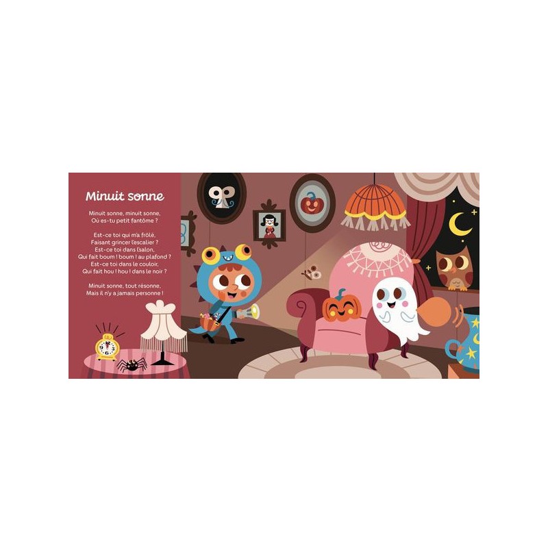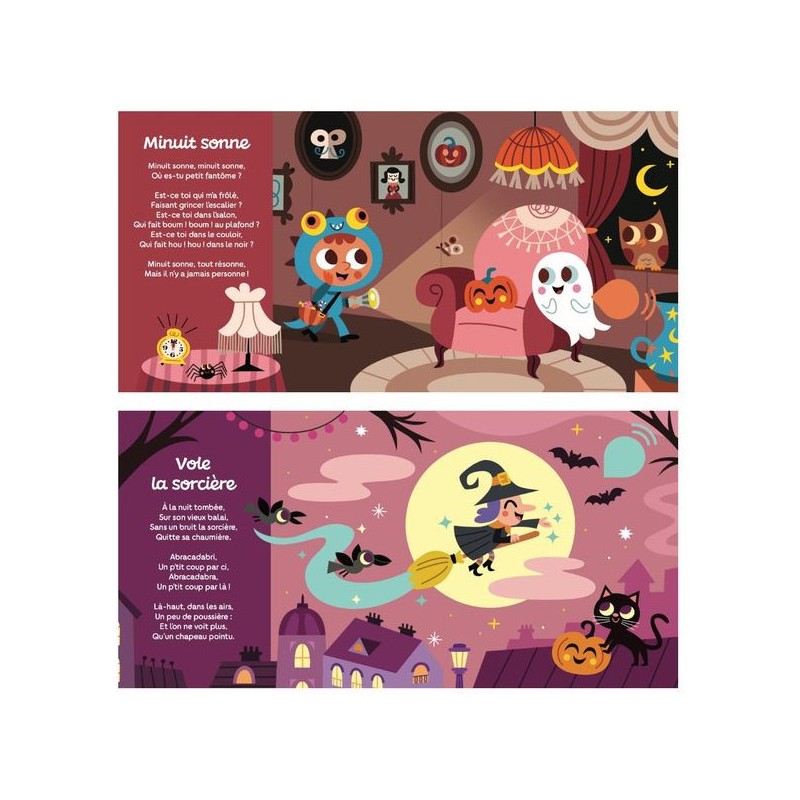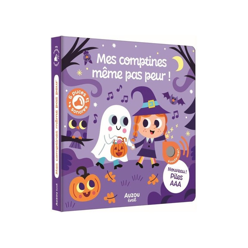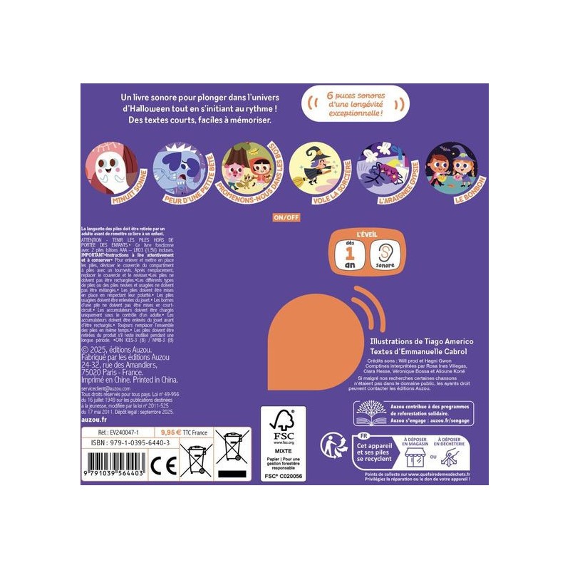 Un livre sonore pour plonger dans l’univers d’Halloween tout en s’initiant au rythme ! Avec des textes courts et faciles à mémoriser. 6 puces sonores d’une belle qualité auditives et d’une longévité exceptionnelle ! 6 comptines même pas peur : * Minuit sonne * Peur d'une petite bête * Promenons-nous dans les bois * Vole la sorcière * L'araignée Gypsie * Le bonbon