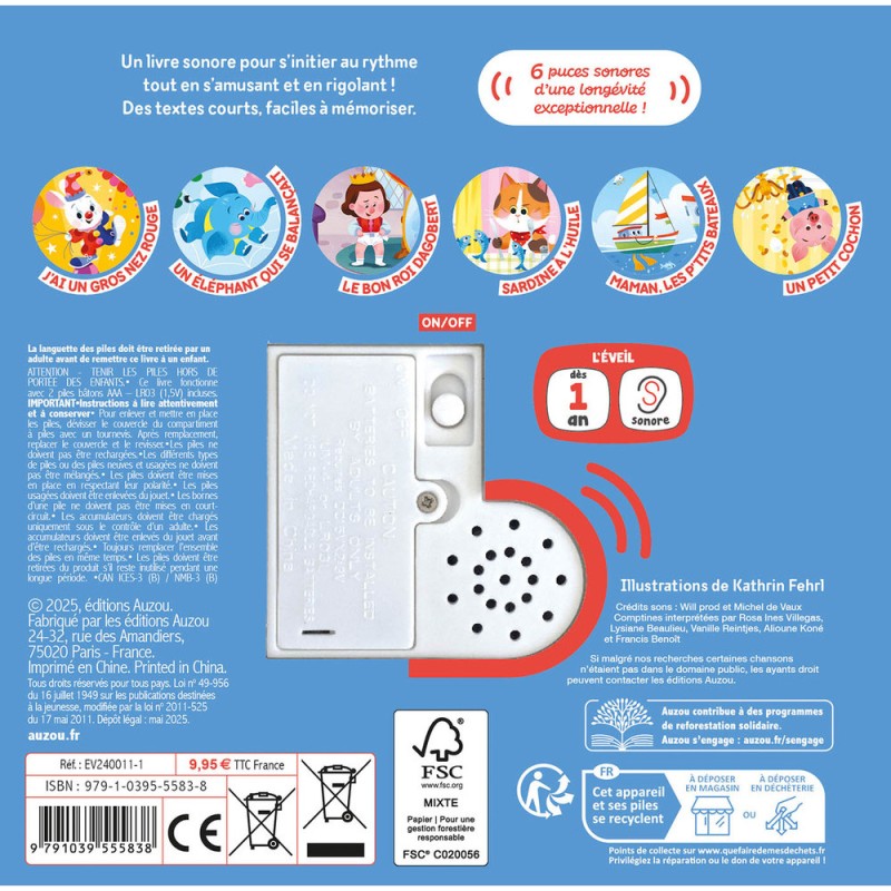 Un livre sonore pour s'initier au rythme tout en rigolant et en s'amusant ! Avec des textes courts et faciles à mémoriser. 6 puces sonores d’une belle qualité auditives et d’une longévité exceptionnelle ! 6 comptines pour rigoler : * J'ai un gros nez rouge * Un éléphant qui se balançait * Le bon roi Dagobert * Sardine à l'huile * Maman les p'tits bateaux * Un petit cochon