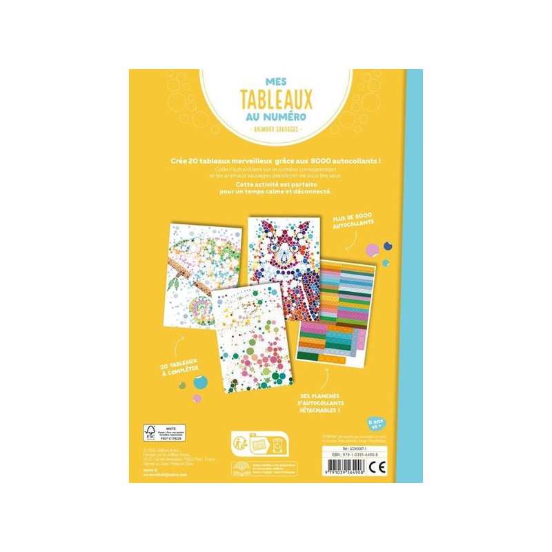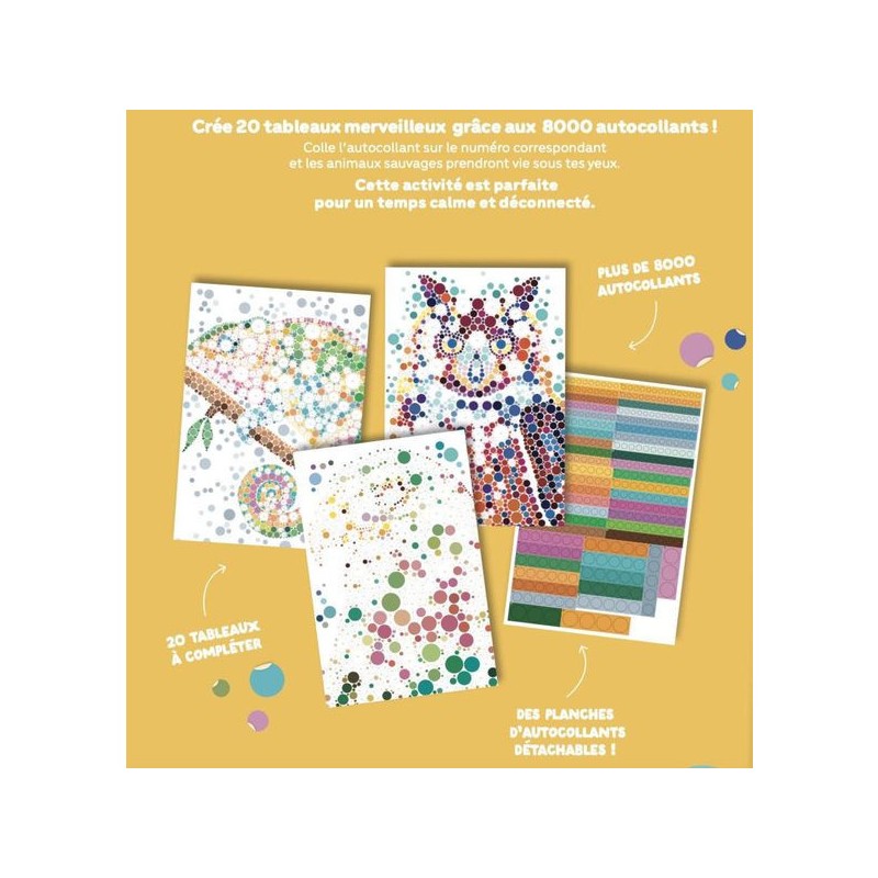 Créé 20 tableaux merveilleux grâce aux 8000 autocollants ! Colle l’autocollant sur le numéro correspondant et les animaux sauvages prendront vie sous tes yeux. Cette activité est parfaite pour un temps calme et déconnecté.