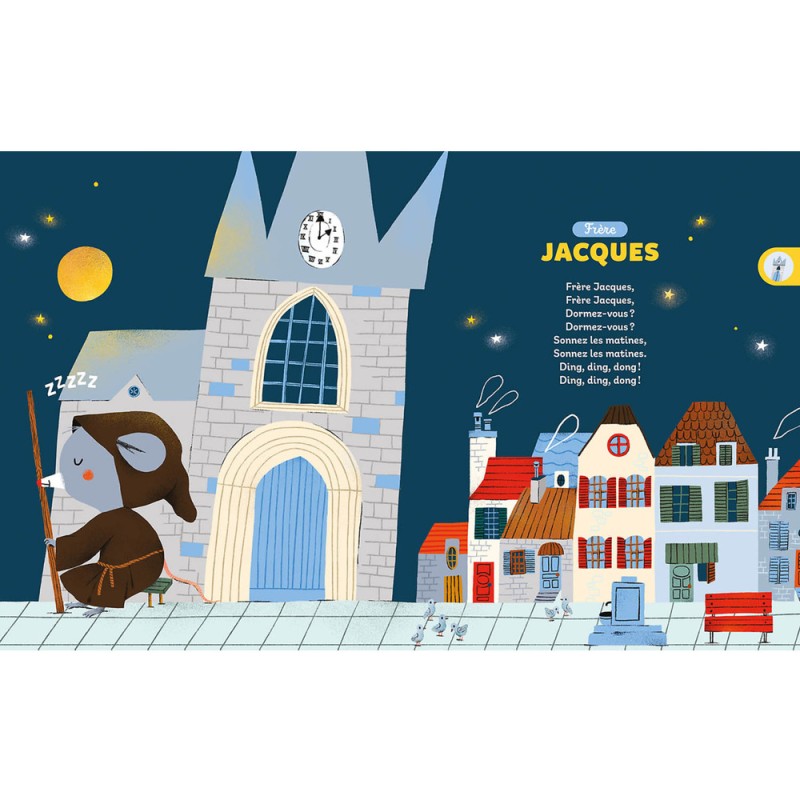 Parmi les 20 comptines à découvrir, retrouvez "Une souris verte", "Frères Jacques" et "Au clair de la lune", "Petit escargot", "J'ai un gros nez rouge", et "La famille tortue", ...