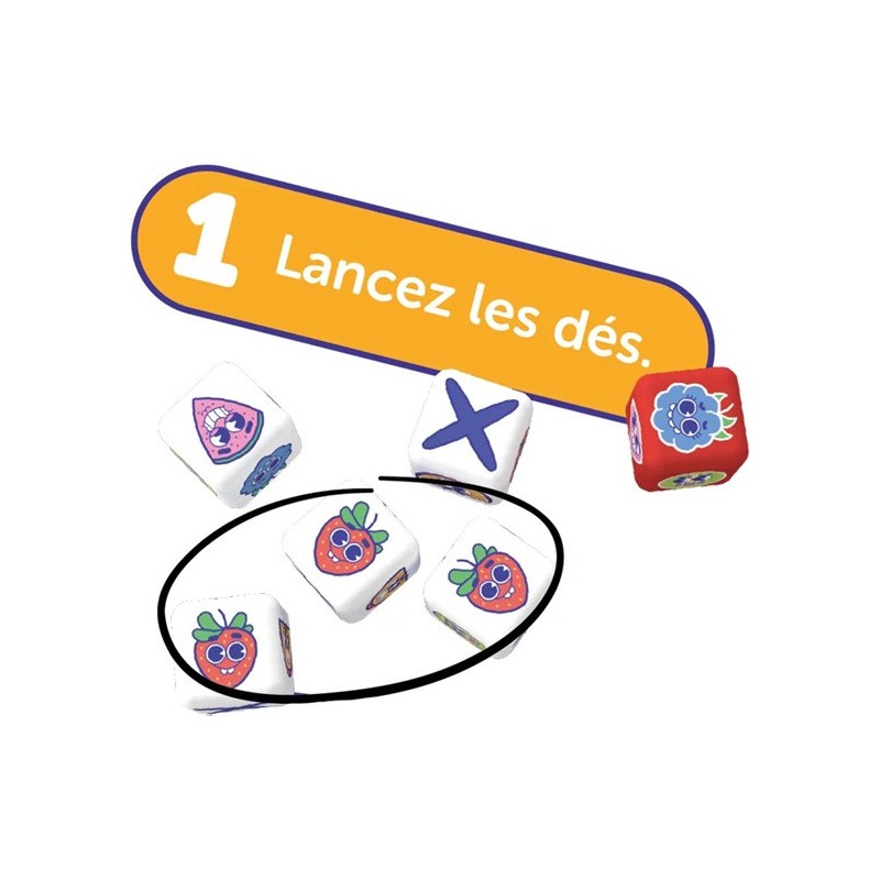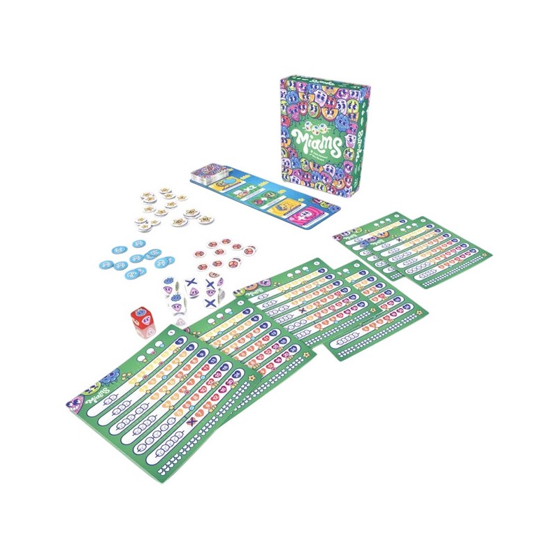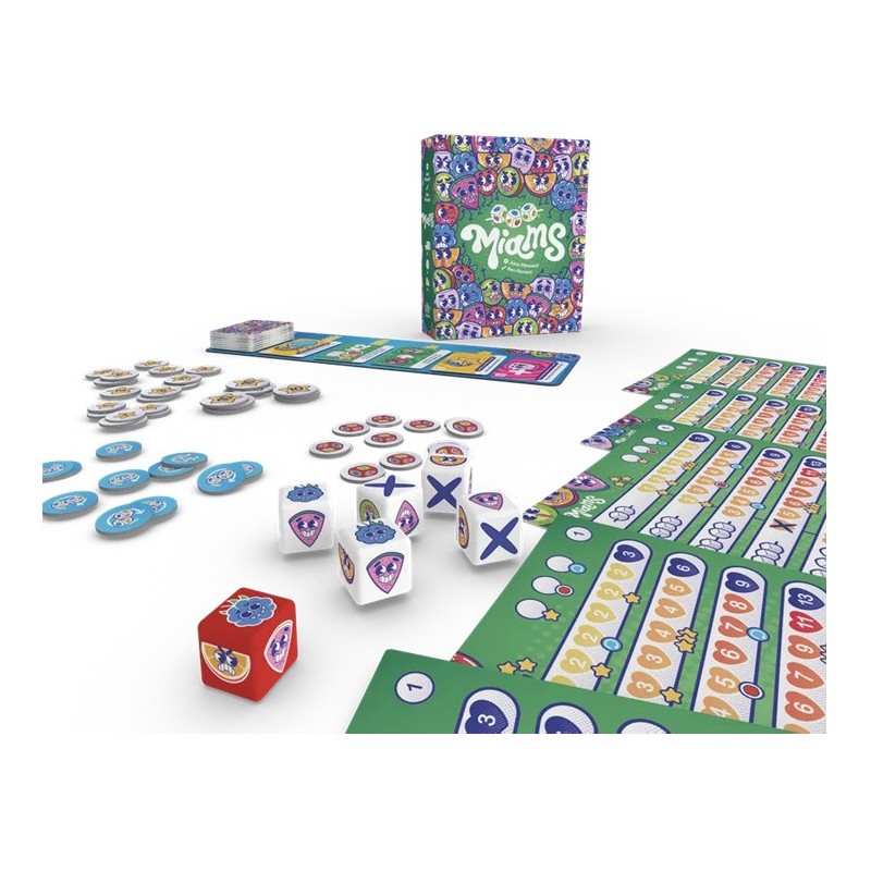Miams est un jeu de dés survitaminé pour toute la famille dès 10 ans. Lancez vos dés, composez des combinaisons de fruits (paire, brelan, full, carré, suite ou miams), puis cochez les cases de votre feuille pour marquer des points et des bonus. Le but : avoir coché 50 cœurs avant vos adversaires et marquer le maximum de points ! Chaque lancer vous offre des choix : quelles brochettes de fruits avez-vous le plus de chance de générer ? Quels dés relancer ? Faut-il utiliser le dé rouge bonus ? A chaque tour, vous pourrez aussi des cartes Miams aux effets variés pour booster votre stratégie : effets permanents, bonus immédiats ou fin de tour... Pimpez votre jeu des bons effets pour enchaîner les combos ! Accessible dès 10 ans, Miams offre une rejouabilité élevée grâce à ses combinaisons multiples et à la rivière de cartes. Vous aurez aussi un mode solo pour vous mesurer à l'Ia (L'Incroyable Affamé). Des heures de fun en perspective ! Contenu : 1 tapis de jeu, 42 cartes, 48 jetons étoiles, 12 jetons relance, 12 jetons dé rouge, 1 mini plateau solo, 1 bloc de 100 feuilles détachables, 5 dés blancs, 1 dé rouge.