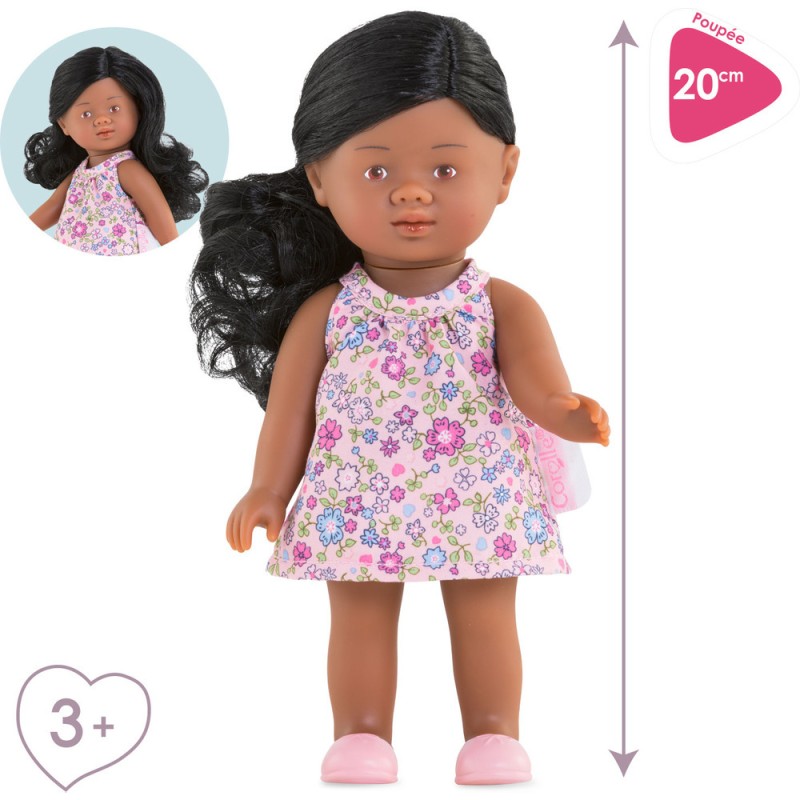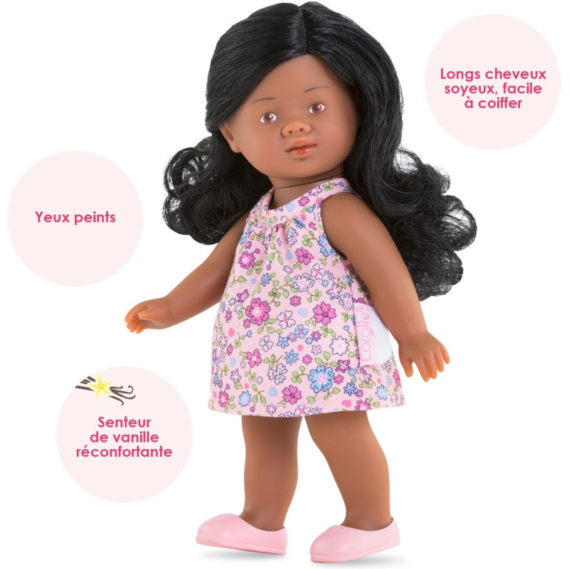 Elle a un corps tout en vinyle doux au toucher et à la délicate senteur de vanille. Cette Mini Corolline a la peau noire et ses yeux marron sont peints sur son visage. Elle a des cheveux longs noirs, bouclés et soyeux pour faciliter le coiffage.