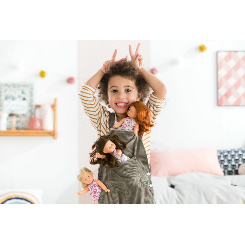 Elle est habillée d’une robe fleurie « trois trous », d’une culotte et d’une paire de chaussures moulées assorties. La mini poupée mini Corolline Rosaly est vendue dans son emballage "boîte cadeau" fleuri, prête à offrir !