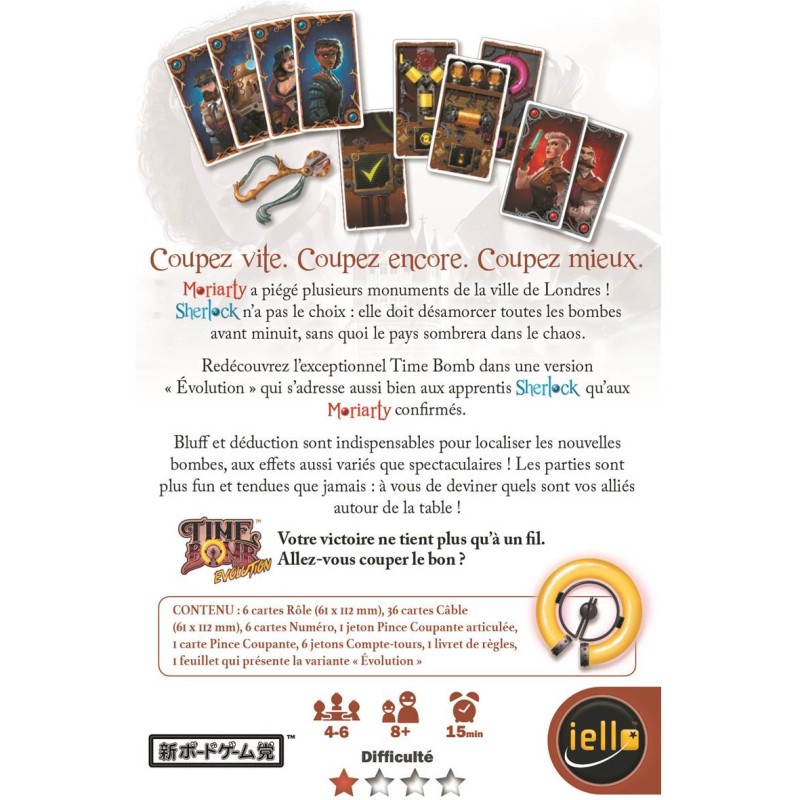 Redécouvrez l'exceptionnel Time Bomb dans une version "Évolution" qui s'adresse aussi bien aux apprentis Sherlock qu'aux Moriarty confirmés.Bluff et déduction sont indispensables et nécessaires pour localiser les nouvelles bombes, aux effets aussi variés que spectaculaires ! 6 types de bombes différentes disposant chacune d'un pouvoir particulier pour donner encore plus de fil à retordre à Sherlock !Les parties sont plus fun et tendues que jamais: à vous de deviner quels sont vos alliés autour de la table !Votre victoire ne tient plus qu'à un fil. Allez-vous couper le bon ?