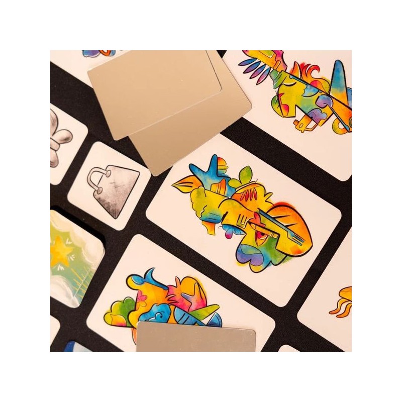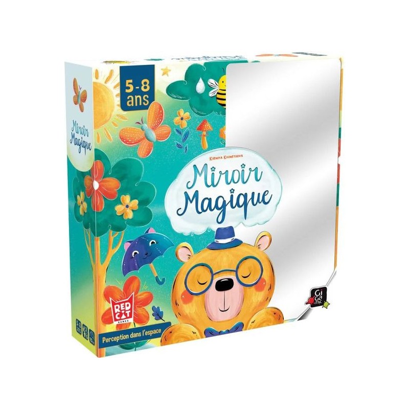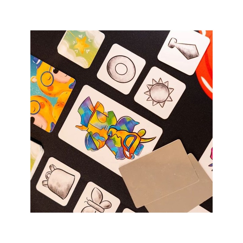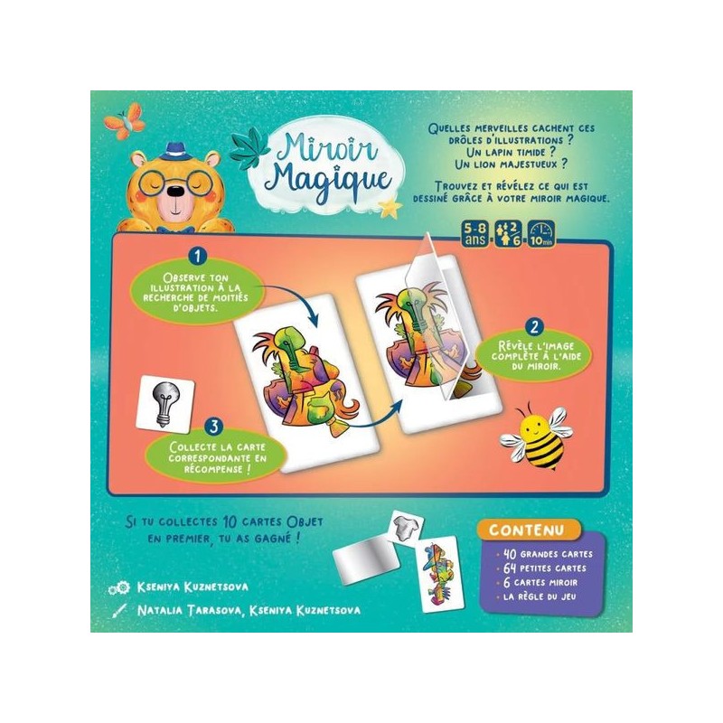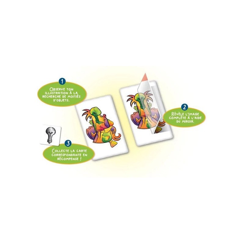 Quelles merveilles se cachent dans ces curieuses images ? Est-ce un lion assis ? Ou un lapin timide ? Ou alors les deux ? Découvrez qui vous attend de l'autre côté du miroir ! Transformez les moitiés d’image en un tout à l'aide des cartes miroirs : une ligne courbe se révèle être une aubergine, et un drôle de gribouillis est en fait un palmier géant. La première personne qui a retrouvé 10 objets gagne la partie !