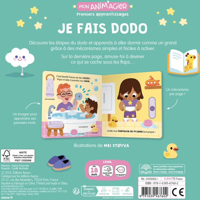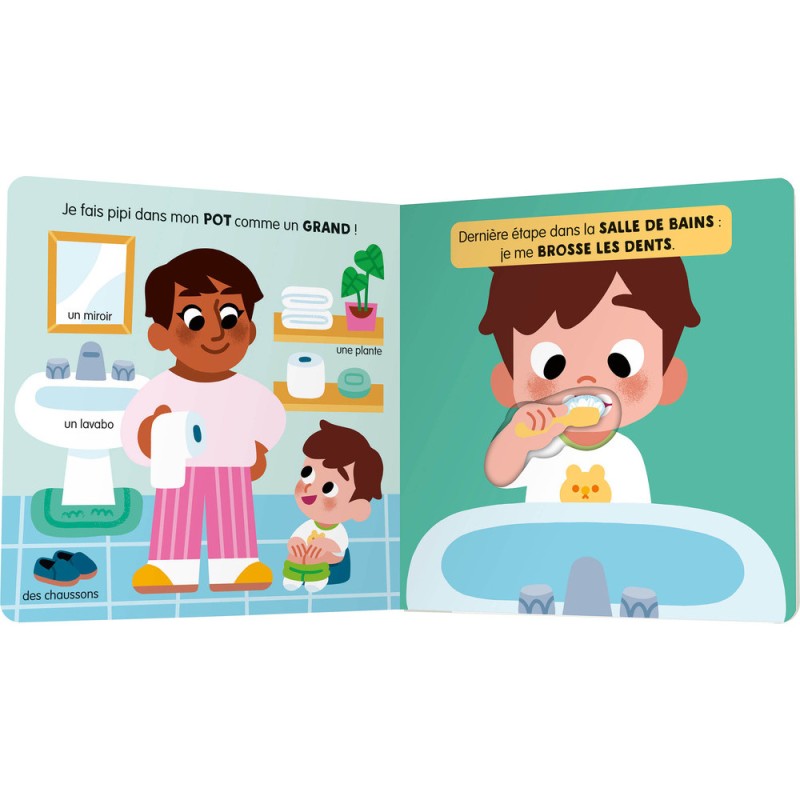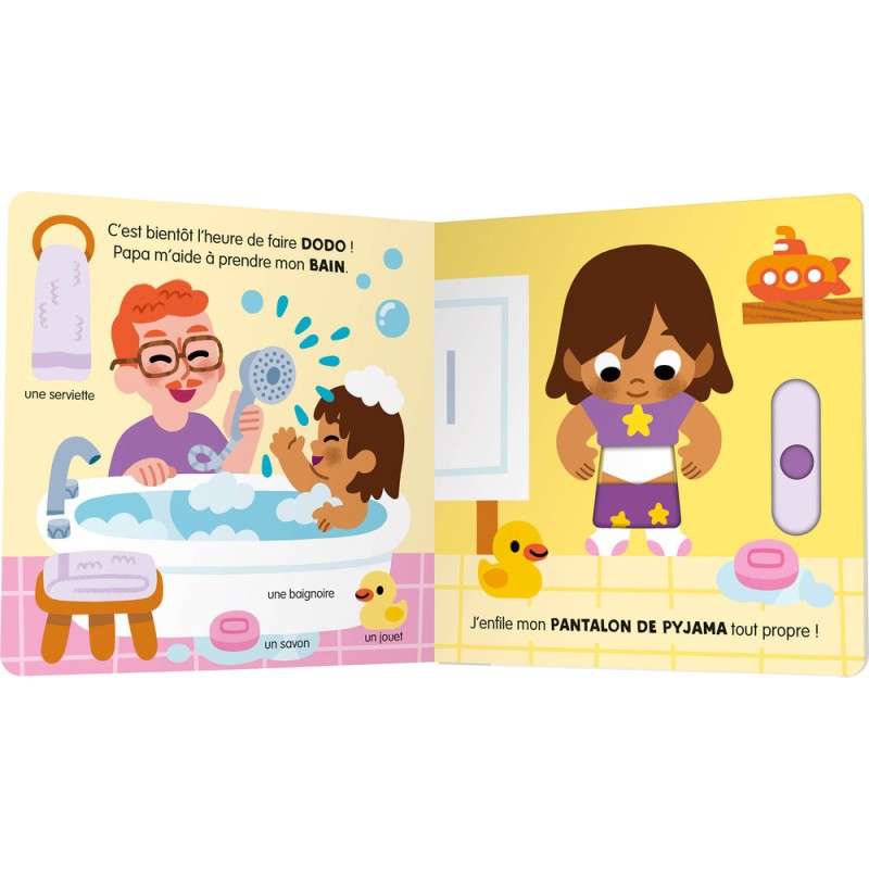 Avec ces 5 mécanismes faciles à activer pour les petites mains, et ses 4 flaps à souleverà la fin pour valider les acquis, ce livre interactif offre un outil ludique complet pour les enfants et leurs parents dans le rituel du soir. De belles illustrations réalistes et colorés permettent aux enfants de s’identifier facilement.