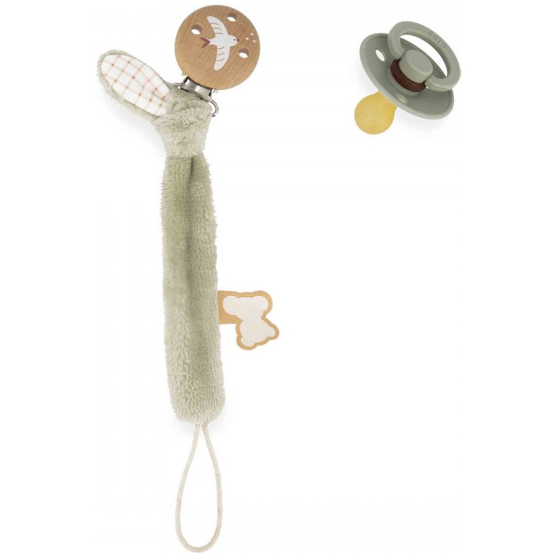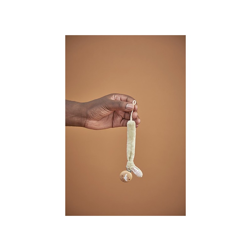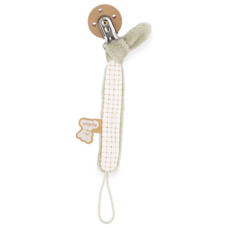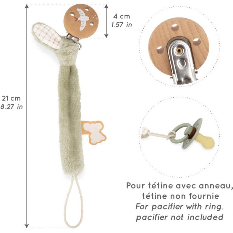 Elle se fixe facilement aux vêtements grâce à son système d'attache sécurisé en bois et convient aux tétines avec anneau. Elle possède un design bi-matières : d’un côté, une fourrure verte toute douce qui apporte confort et tendresse et de l’autre, un imprimé vichy délicat pour varier les sensations au toucher.