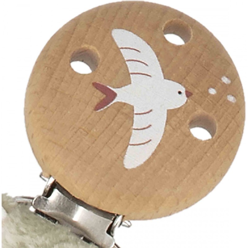 Avec son style intemporel, cet accessoire s’intègre parfaitement à l’univers tendre de bébé et devient un indispensable dès la naissance. L’accroche en bois, sérigraphié de jolies hirondelles, ajoute une note poétique et naturelle. Un joli nœud vient sublimer l’attache tout en invitant bébé à développer sa préhension.