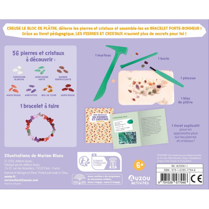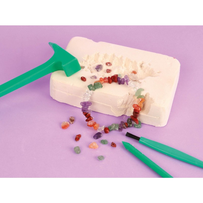 L’enfant déterre de magnifiques pierres, puis les utilise pour assembler un bracelet unique, à la fois joli et porte-bonheur. Une activité ludique qui mêle découverte, patience et créativité ! Le coffret est constitué d’un bloc à creuser, d’outils, de 56 pierres, d'un fil élastique et d’un livret contenant plein d’informations passionnantes. Les enfants découvrent la géologie mais aussi le pouvoir des pierres et des cristaux !