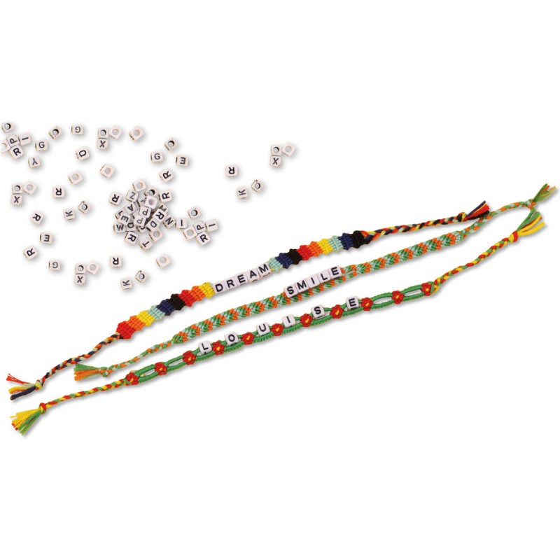 Un magnifique coffret comportant 8 fils de couleurs différentes pour réaliser plein de bracelets brésiliens, ainsi que 400 perles lettres. Un passe-fil permet de faire passer facilement les perles lettres dans les fils des bracelets. Des tutos vidéos sont inclus via un Qr code !