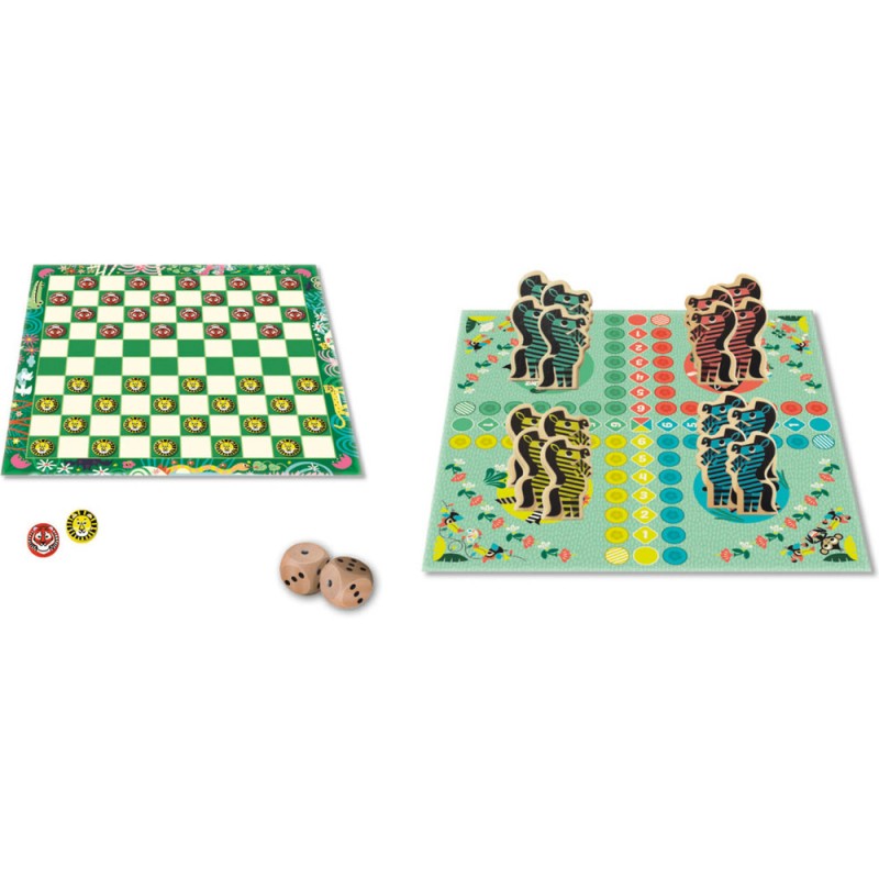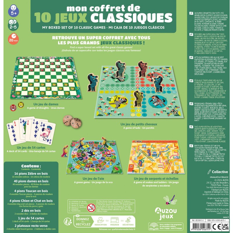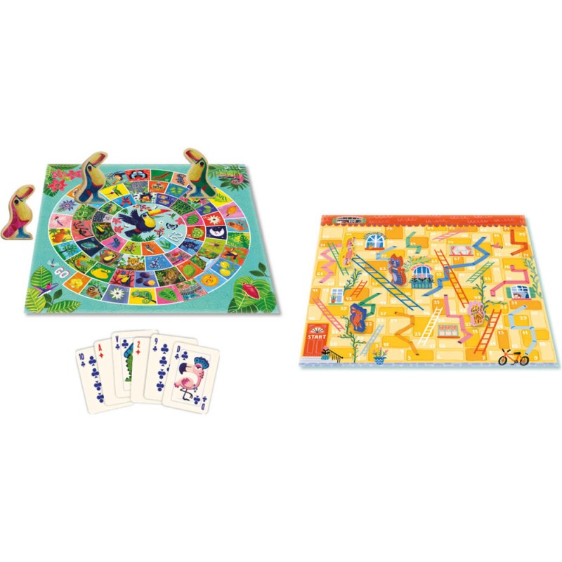 Un grand coffret réunissant tous les grands classiques : jeu de dames, jeu de l’oie, jeu des petits chevaux, jeu de serpents et échelles et un jeu de 54 cartes avec 6 règles de jeux (bataille, bataille corse, président, mistigri, menteur, huit américain) ! Chaque jeu est superbement illustré dans un univers qui revisite la thématique classique : des zèbres pour remplacer les chevaux, des toucans pour les oies... ! Contenu : Pions en bois : 40 pions Dames, 16 Zèbres, 4 pions Oie, 4 pions Serpents et échelles, 2 dés. 1 jeu de 54 cartes / 2 plateaux recto verso