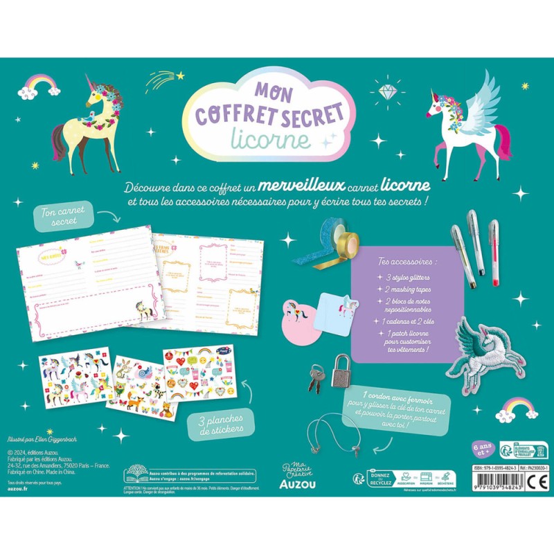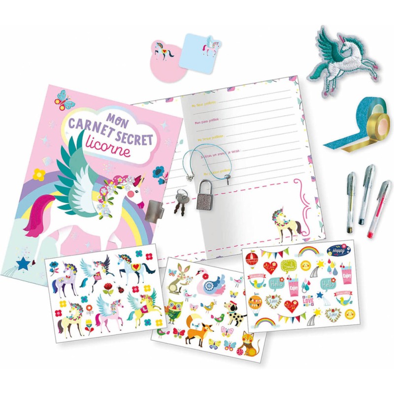 Il contient un carnet secret qui se ferme avec cadenas, et de la jolie papeterie licorne : un écusson thermocollant, des autocollants, des post-it, des stylos, du masking tape.