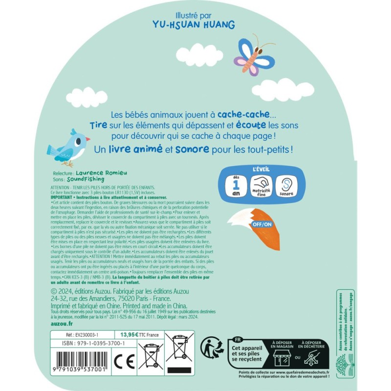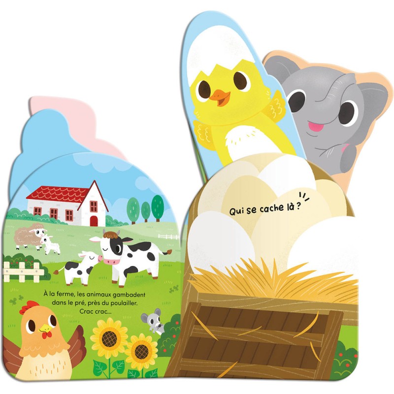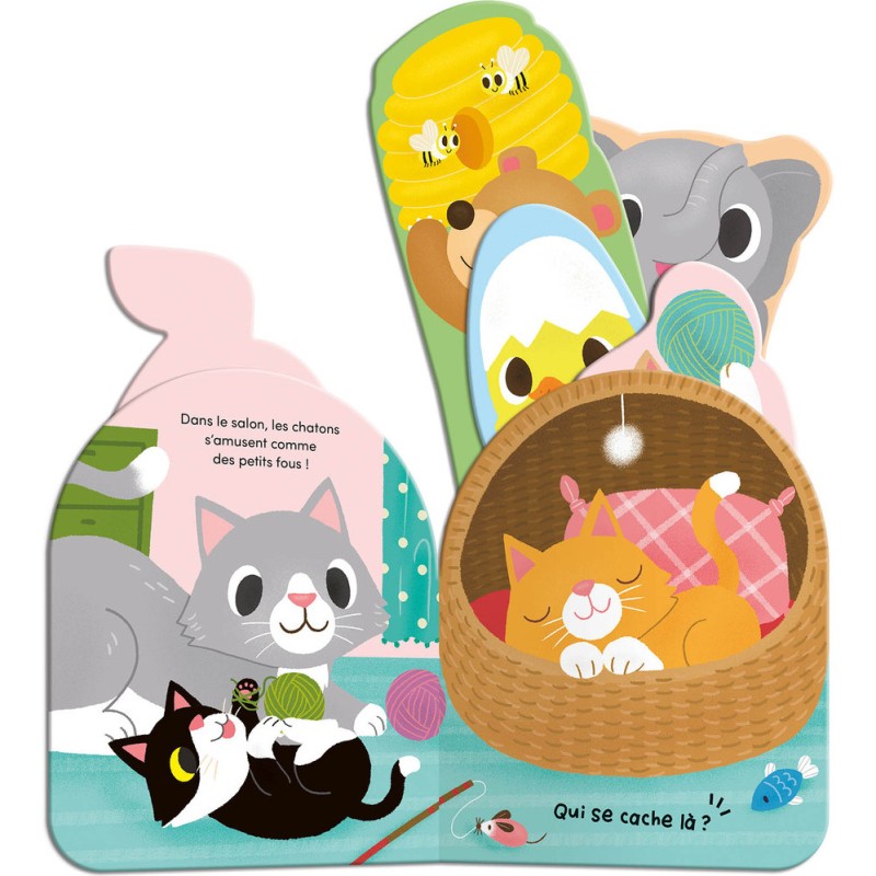 Les bébés animaux jouent à cache-cache… Tire sur les éléments qui dépassent et écoute les sons pour découvrir qui se cache à chaque page.