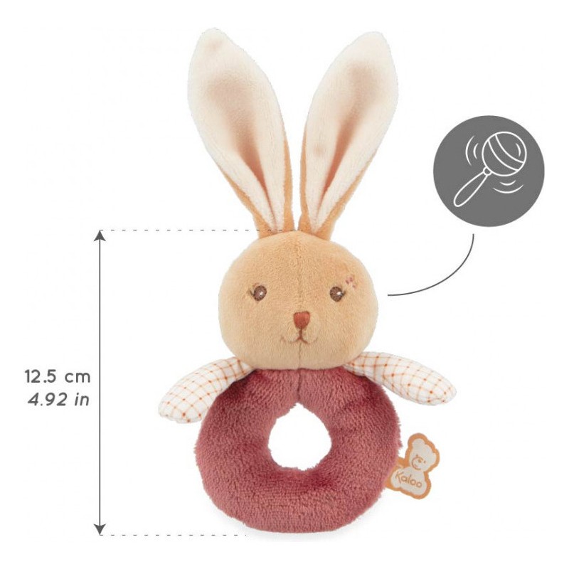 Un doudou hochet pensé pour stimuler l’éveil de bébé tout en douceur ! Grâce au grelot intégré dans la tête du lapin, ce jouet d'éveil sensoriel stimule la curiosité de bébé lorsqu'il le secoue. La forme en anneau de ce doudou permet à bébé de l’attraper facilement, encourageant ses premiers gestes précis et l’exploration de ses mains. Sa belle fourrure bordeaux est très douce au toucher, ce qui procure une sensation agréable pour les petites mains de bébé. Cette texture stimulante invite aussi à de tendres câlins. Avec ses bras en popeline et en imprimé vichy, ce doudou lapin arbore un look tendre et intemporel, propre à l’univers Kaloo. Ce doudou hochet est un indispensable pour amuser votre bébé : il favorise son développement sensoriel et sa coordination main-œil. Son petit format de 12,5 cm en fait un jouet d'éveil facile à emporter partout : il se glisse facilement dans le sac à langer ou la poussette pour que bébé ait toujours son compagnon tout doux à portée de main pour des moments de jeux. Confectionné avec soin, ce doudou est composé avec au moins 80% de matières recyclées, y compris son rembourrage en polyester recyclé. Adapté aux petits dès la naissance, il peut être lavé en machine à 30°, pour un entretien facile. Des heures de jeu et de découvertes attendent votre bébé avec ce doudou hochet lapin !