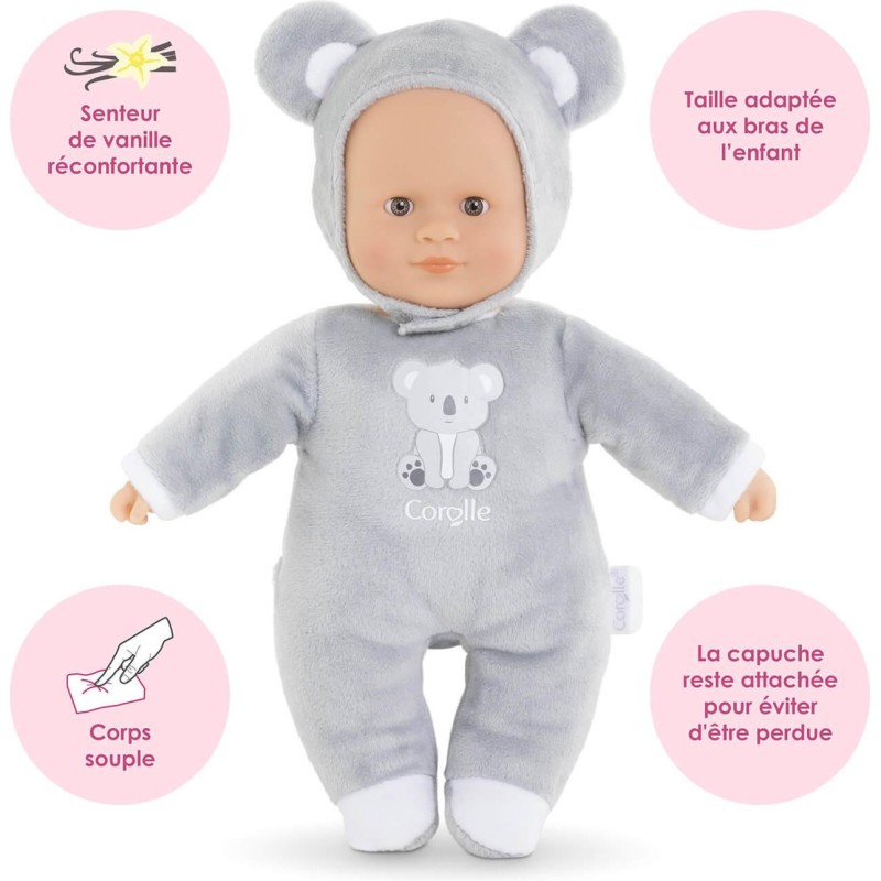 Le Pti'Coeur Koala possède bien sûr tous les attributs d'un poupon Corolle : sa tête et ses mains sont en vinyle doux au toucher, et possèdent une délicate senteur de vanille, réconfortante pour les tout-petits.