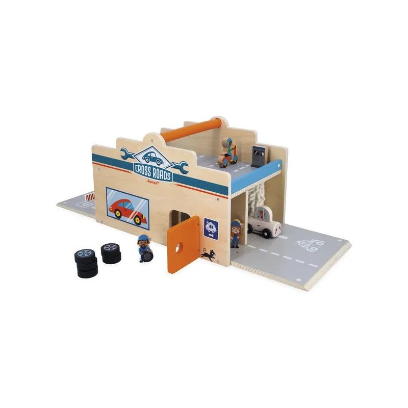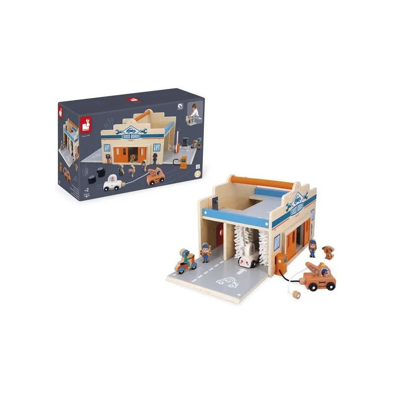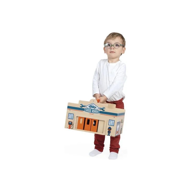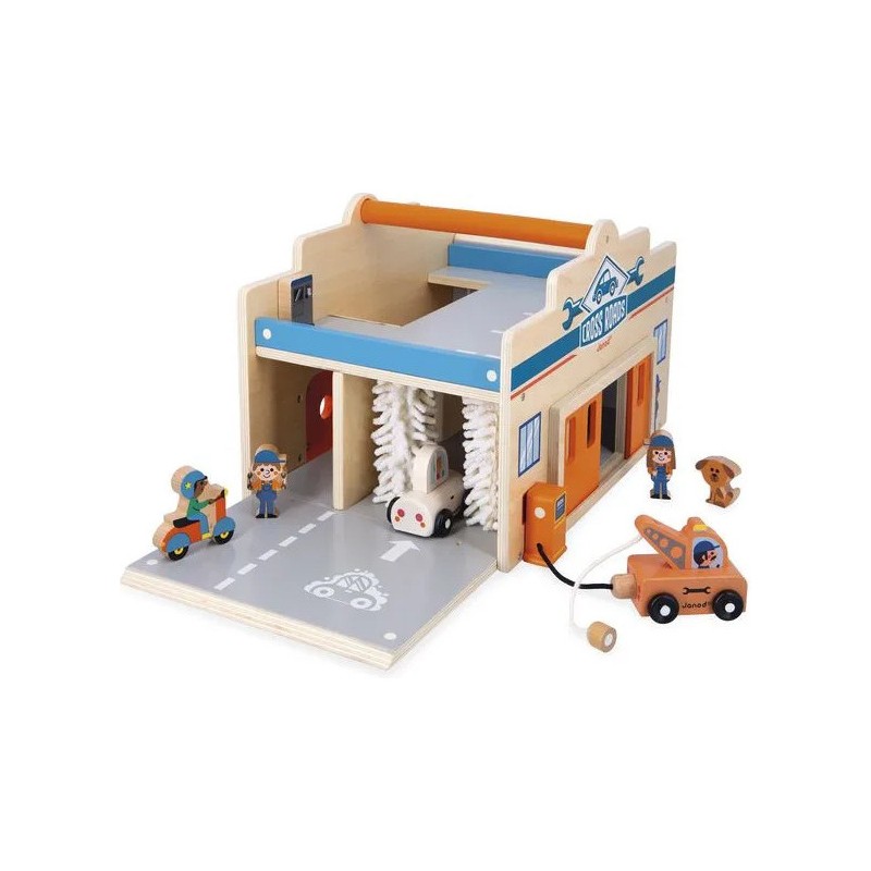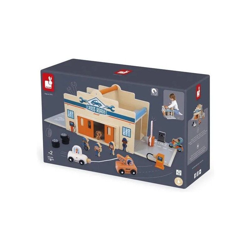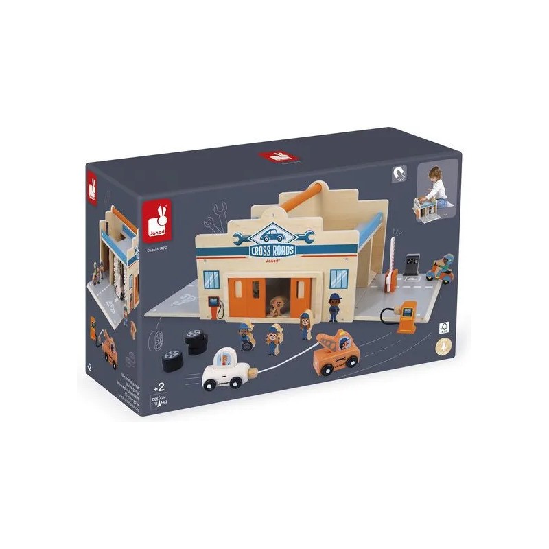 « Une panne ? Allons voir les mécanos ! » Ce grand garage en bois convient aux enfants, dès l’âge de 2 ans. Avec ses multiples fonctionnalités, c'est Le bon endroit pour confier sa voiture : elle repart prête pour de nouvelles aventures ! Avec ses nombreux accessoires, ce garage rend le jeu encore plus réaliste et stimule l’imagination des petits mécanos ! Il comprend 15 accessoires en bois : 1 dépanneuse, 1 voiture, 5 pneus, 3 mécaniciens, 1 personnage en scooter, 1 chien, 1 pompe à essence, 1 horodateur et 1 barrière amovible qui donne accès au parking à l'étage. Ce dernier permet de garer les véhicules en attendant leur tour à l’atelier : comme dans un vrai garage ! En cas de panne, la dépanneuse est envoyée pour remorquer la voiture jusqu'au garage. Grâce à son système à aimant, le rapatrillement se fait sans pépins ! Ni une ni deux, les mécaniciens attrapent leurs outils pour passer à l'action, sous l'oeil attentif du chien, toujours prêt à superviser les réparations ! Un vrai travail d'équipe ! Besoin d'un petit nettoyage ? Le garage fait aussi office de station de lavage automatique ! Des rouleaux tout doux sont prévus pour éviter toute rayure sur la voiture. En plus de tous ses accessoires, ce garage a plein de petits détails qui rendent le jeu encore plus vrai : des portes qui coulissent, une porte qui s’ouvre grâce à des élastiques et une rampe pour accéder au parking. Et avec ses ouvertures aimantées des deux côtés, les enfants peuvent accéder au garage comme ils veulent et s’amuser encore plus ! Nomade, le garage se transporte facilement grâce à sa poignée sur le dessus. Une fois refermé, tous les accessoires se rangent à l’intérieur : pratique pour tout emporter et ne rien perdre ! Ce garage Janod est issu de notre collection Cross Roads : une série de tapis de jeu avec circuits, encore plus ludiques quand ils sont complétés par nos sets de cubes et nos petits véhicules en bois. Le garage convient particulièrement au tapis de jeu Ville, mais s’associe tout aussi bien avec d’autres tapis de la gamme. Il est composé de bois certifié Fsc™. « Vroum, c’est reparti pour un tour ! »