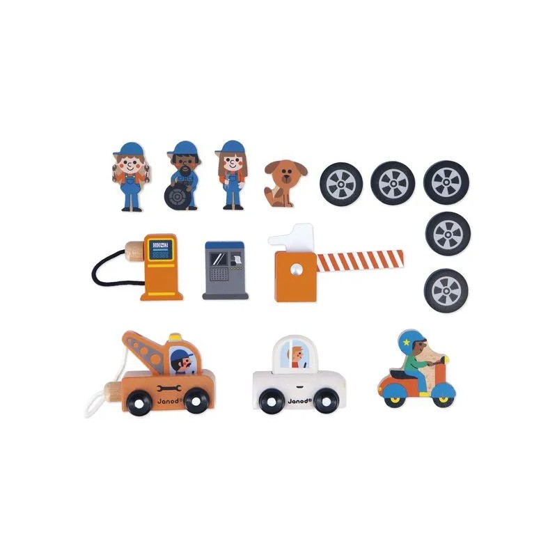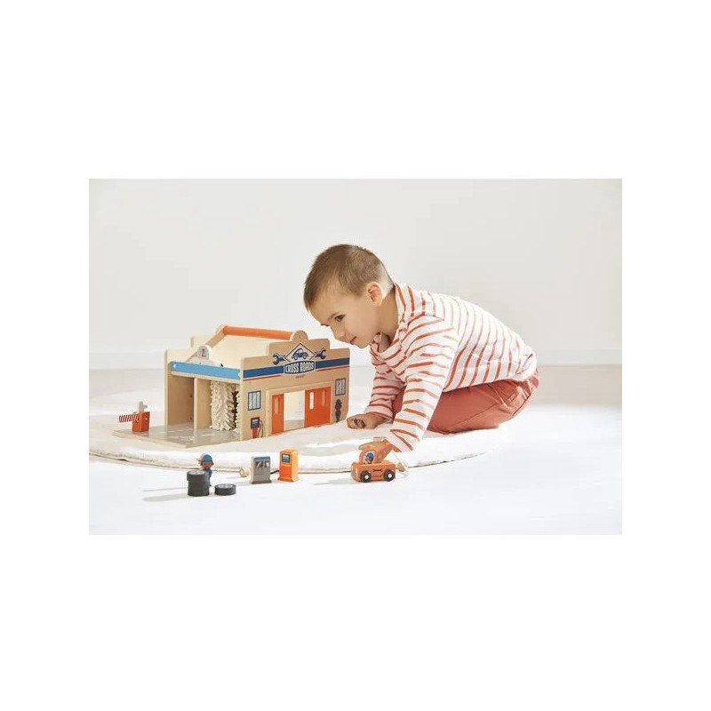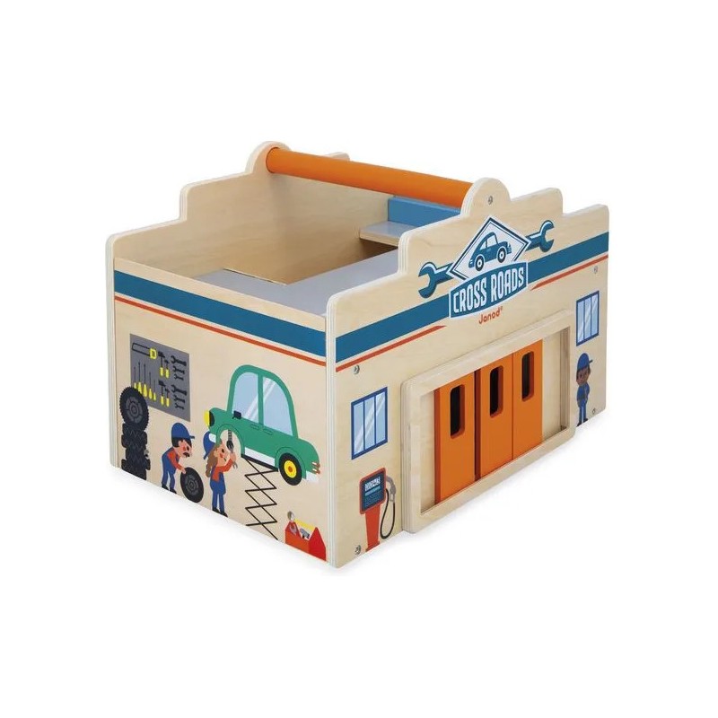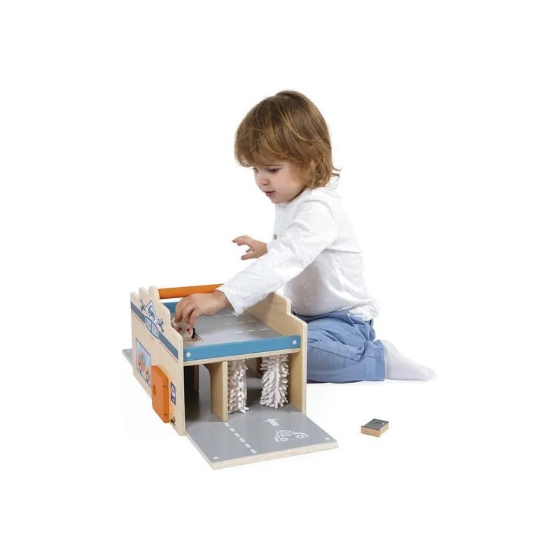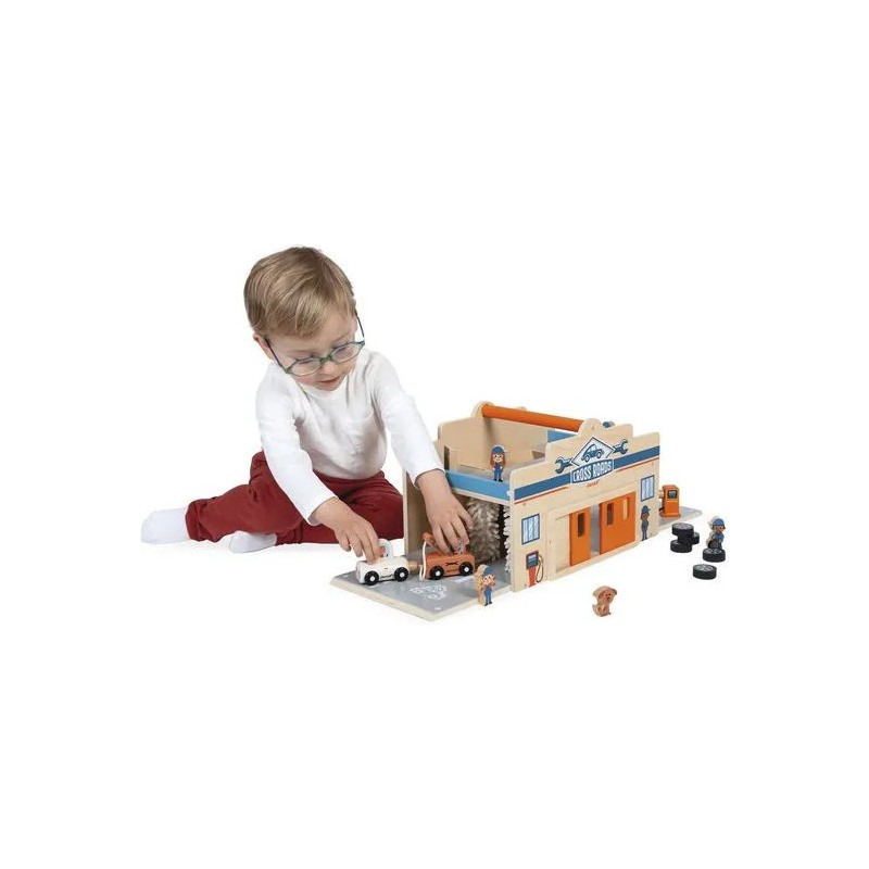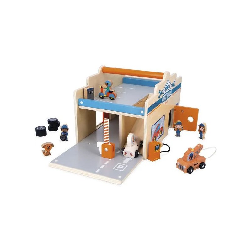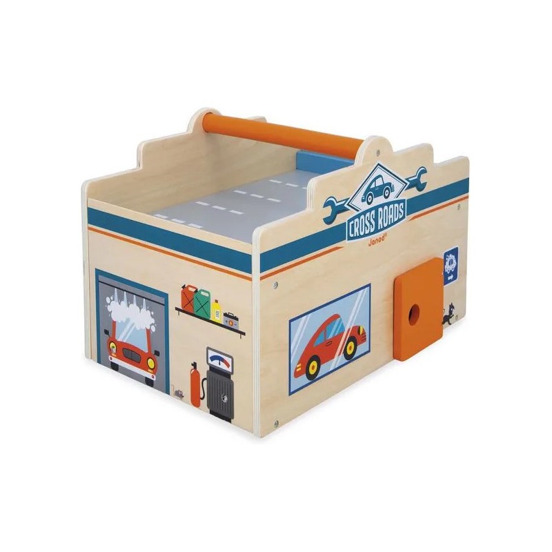 « Une panne ? Allons voir les mécanos ! » Ce grand garage en bois convient aux enfants, dès l’âge de 2 ans. Avec ses multiples fonctionnalités, c'est Le bon endroit pour confier sa voiture : elle repart prête pour de nouvelles aventures ! Avec ses nombreux accessoires, ce garage rend le jeu encore plus réaliste et stimule l’imagination des petits mécanos ! Il comprend 15 accessoires en bois : 1 dépanneuse, 1 voiture, 5 pneus, 3 mécaniciens, 1 personnage en scooter, 1 chien, 1 pompe à essence, 1 horodateur et 1 barrière amovible qui donne accès au parking à l'étage. Ce dernier permet de garer les véhicules en attendant leur tour à l’atelier : comme dans un vrai garage ! En cas de panne, la dépanneuse est envoyée pour remorquer la voiture jusqu'au garage. Grâce à son système à aimant, le rapatrillement se fait sans pépins ! Ni une ni deux, les mécaniciens attrapent leurs outils pour passer à l'action, sous l'oeil attentif du chien, toujours prêt à superviser les réparations ! Un vrai travail d'équipe ! Besoin d'un petit nettoyage ? Le garage fait aussi office de station de lavage automatique ! Des rouleaux tout doux sont prévus pour éviter toute rayure sur la voiture. En plus de tous ses accessoires, ce garage a plein de petits détails qui rendent le jeu encore plus vrai : des portes qui coulissent, une porte qui s’ouvre grâce à des élastiques et une rampe pour accéder au parking. Et avec ses ouvertures aimantées des deux côtés, les enfants peuvent accéder au garage comme ils veulent et s’amuser encore plus ! Nomade, le garage se transporte facilement grâce à sa poignée sur le dessus. Une fois refermé, tous les accessoires se rangent à l’intérieur : pratique pour tout emporter et ne rien perdre ! Ce garage Janod est issu de notre collection Cross Roads : une série de tapis de jeu avec circuits, encore plus ludiques quand ils sont complétés par nos sets de cubes et nos petits véhicules en bois. Le garage convient particulièrement au tapis de jeu Ville, mais s’associe tout aussi bien avec d’autres tapis de la gamme. Il est composé de bois certifié Fsc™. « Vroum, c’est reparti pour un tour ! »