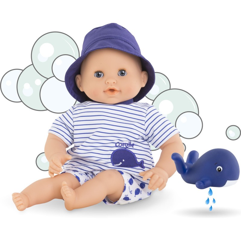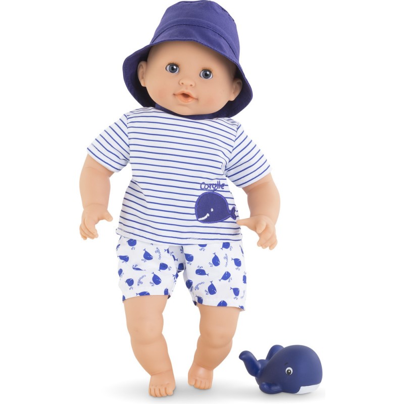 Ce petit poupon à la peau blanche et aux yeux bleus est habillé d'une blouse rayée blanc et bleue, brodée d'une jolie baleine, et d'un short imprimé baleine. Il est coiffé d'un bob bleu.