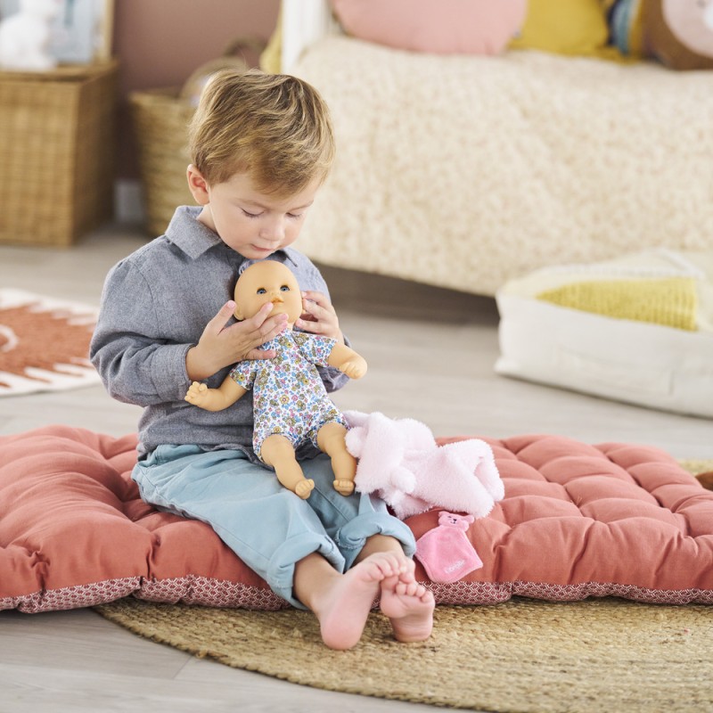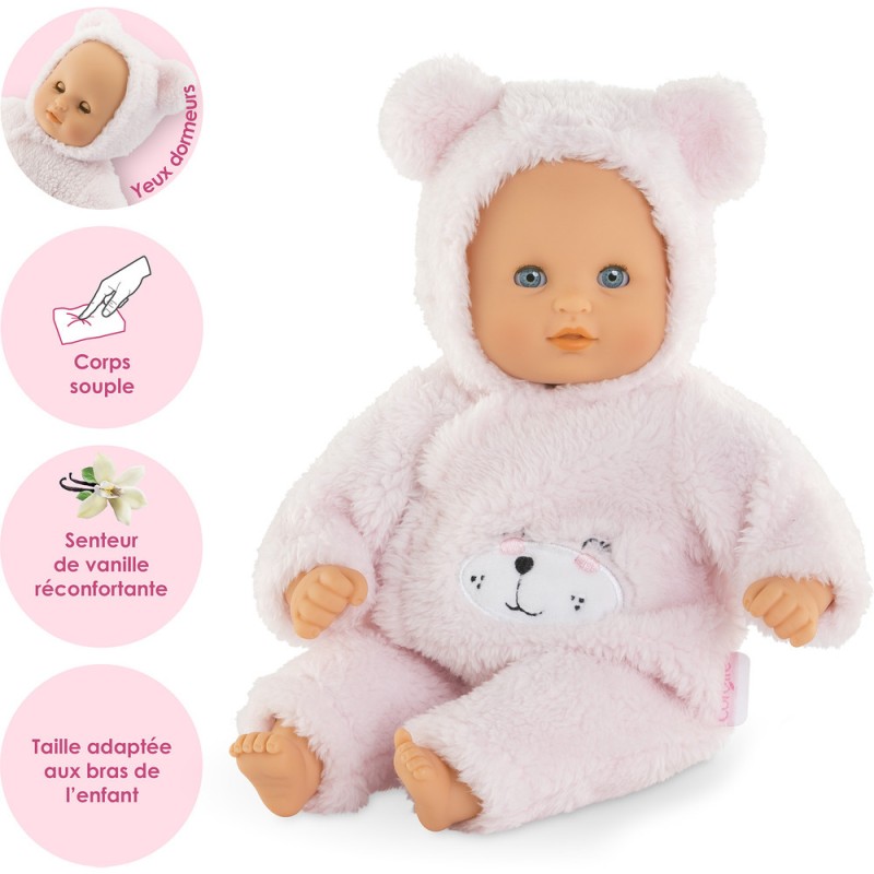 Ce petit poupon a la peau blanche et les yeux bleus. Son visage, ses bras et ses jambes sont en vinyle doux au toucher et possèdent cette délicate senteur de vanille, si reconnaissable des poupons Corolle. Avec ses yeux dormeurs, il fait dodo quand on le couche sur le dos.