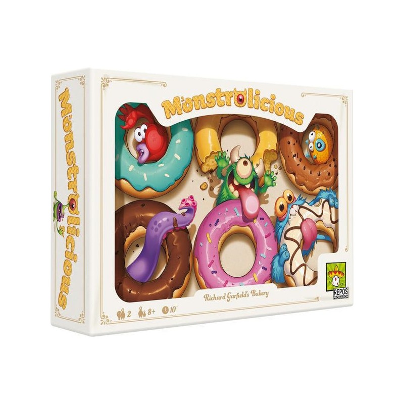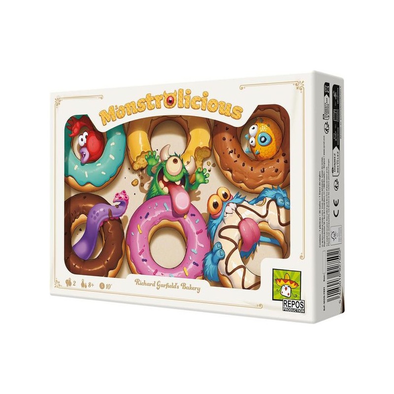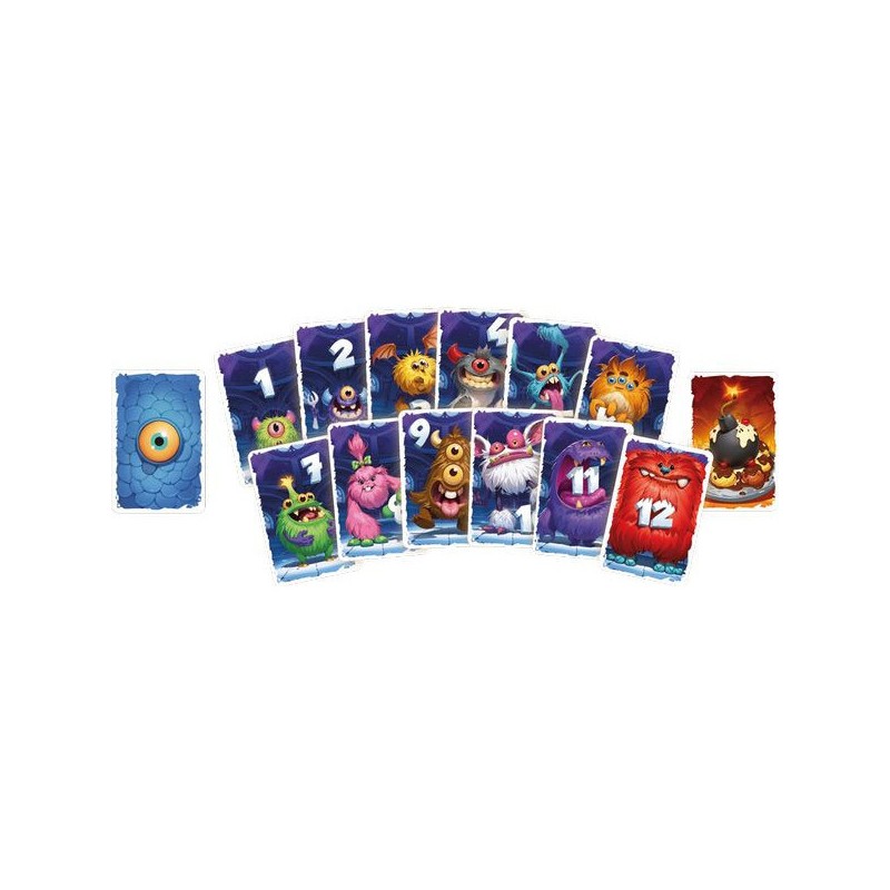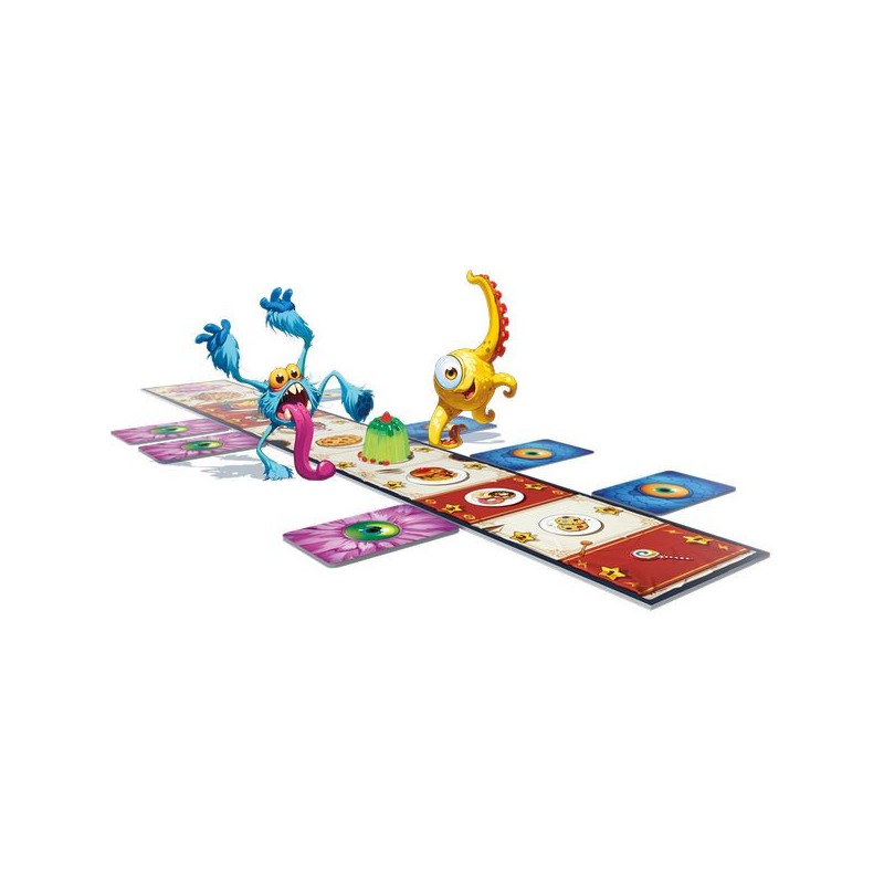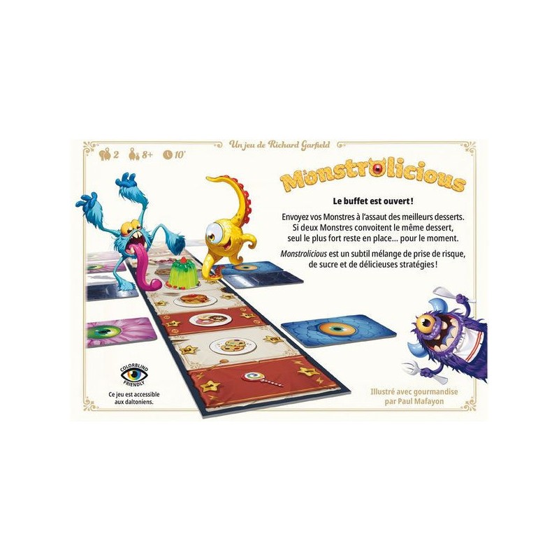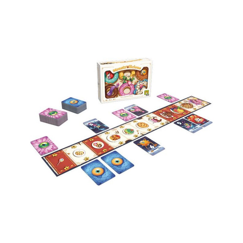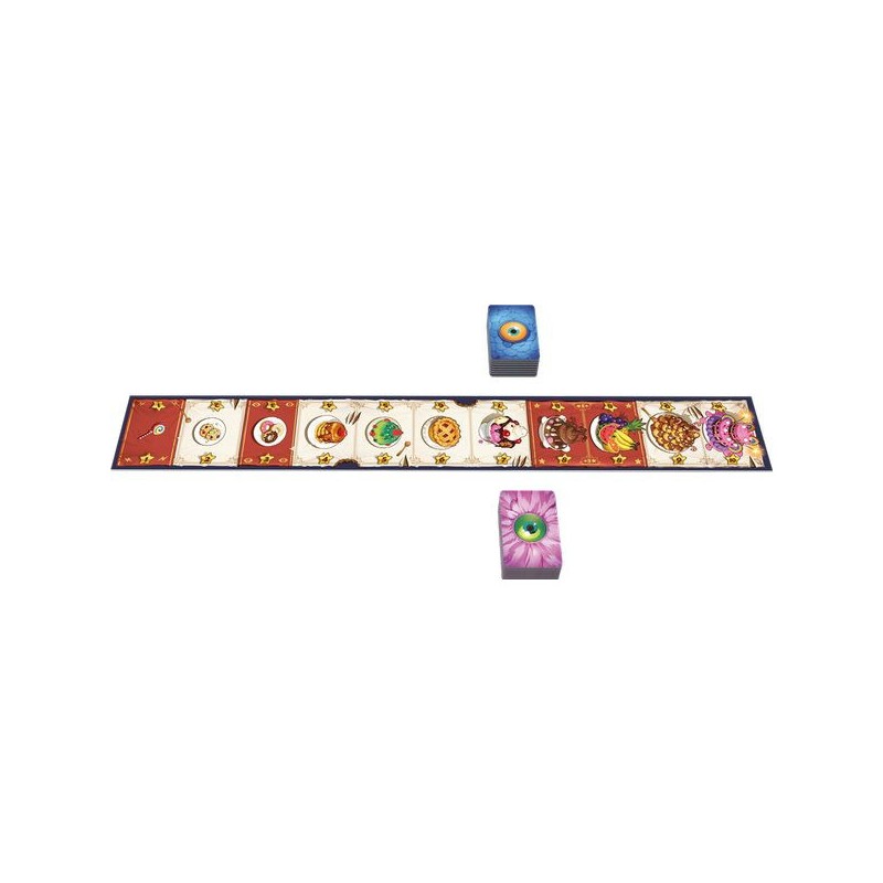 Qui verra sa gourmandise récompensée ? Un joueur contrôle les poilus tandis que le second contrôle les écailleux. Un plateau banquet de pâtisserie est placé entre les joueurs. À votre tour, regardez la première tuile de votre pioche de monstres et placez-là, face cachée, sous l’un des desserts. L’adversaire n’a personne en face ? Vous contrôlez ce délice, sinon, il y a bataille ! Votre opposant révèle sa tuile, pas vous, si votre monstre a une valeur égale ou plus élevée, dites-lui et sa tuile est défaussée. Sinon, c’est vous qui enlevez votre tuile, tout en laissant celle de l’adversaire visible. Attention, si vous tombez sur le piège de l’adversaire, vous perdez automatiquement ! Certains desserts ont des effets spéciaux, comme la sucette, qui ne vaut qu’un point, mais permet de gagner les égalités (même lorsque c’est vous le défenseur !). Quand toutes les tuiles ont été jouées, chaque joueur fait le total des points rapportés par les gâteaux qu’il contrôle pour déterminer le vainqueur. Le plus gourmand sera le meilleur stratège… et bluffeur ! Contenu