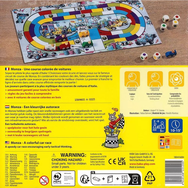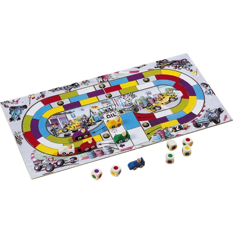 Une turbulente course de voitures pour 2 à 6 joueurs fûtés où il faut user de tactique. Six voitures de course sont prêtes à prendre le départ pour la grande course. Celui qui aura les bonnes couleurs avec les dés et sera assez futé pour les combiner avancera très vite. Contenu : 6 voitures de course en bois, 6 dés multicolores en bois, 1 plateau de jeu. Comment on joue ? - Lance les six dés à la fois en les prenant dans les deux mains. - Essaie alors d'avancer ta voiture en repérant la couleur des dés.Pour cela, compare la couleur des dés avec celle des cases qui se trouvent directement devant ta voiture de course. - Est-ce que la couleur des dés correspond à la couleur des cases ? - Est-ce qu'il y a même plusieurs couleurs qui correspondent successivement à la couleur des cases ? Réfléchis bien pour savoir dans quel ordre tu vas avancer sur les cases ! - Déplace ta voiture de course de manière correspondante. - A chaque fois que tu avances d'une case, retire le dé correspondant. Quand tu ne peux plus avancer, c'est au joueur suivant. Durée : 10 à 15 minutes Pour 2 à 6 joueurs Ce jeu a reçu la distinction Spiel gut Un jeu très amusant qui fait travailler les neurones !
