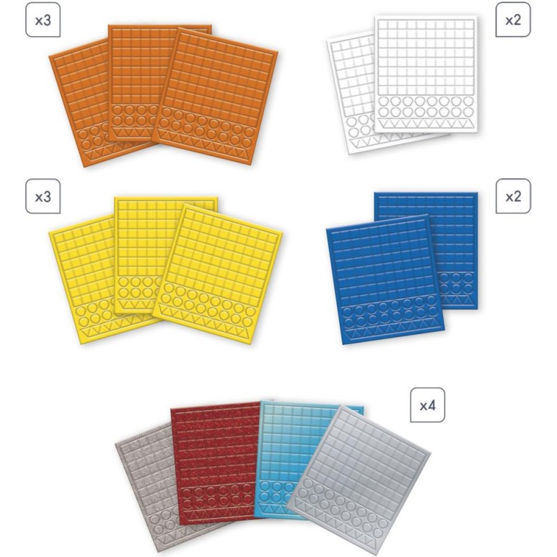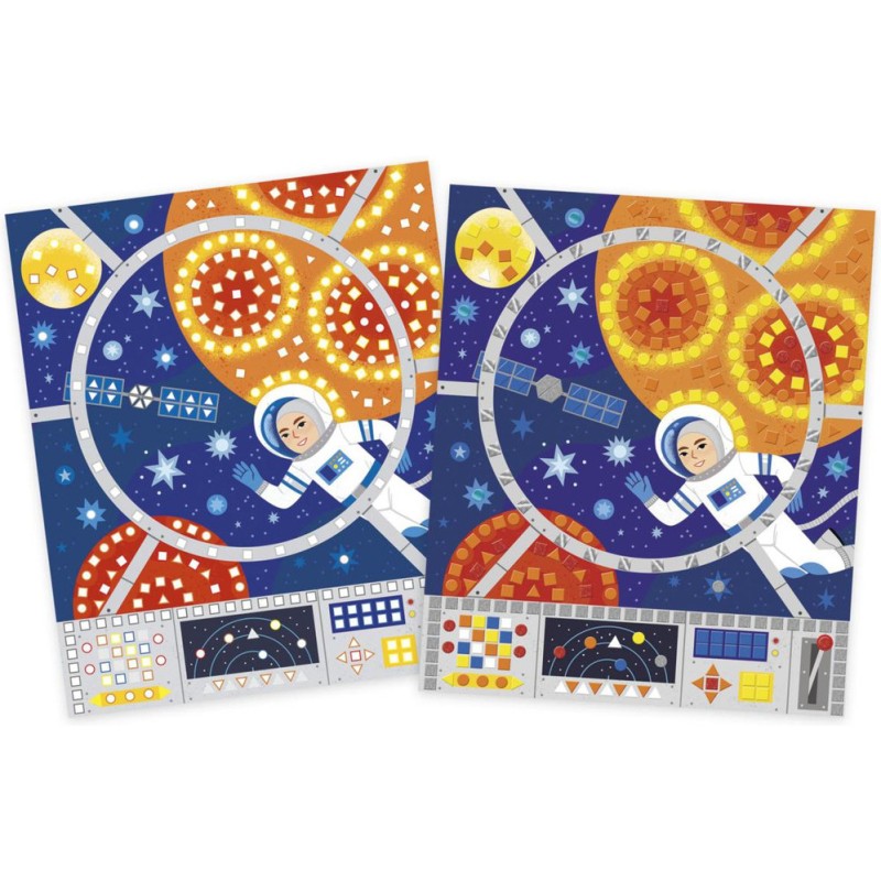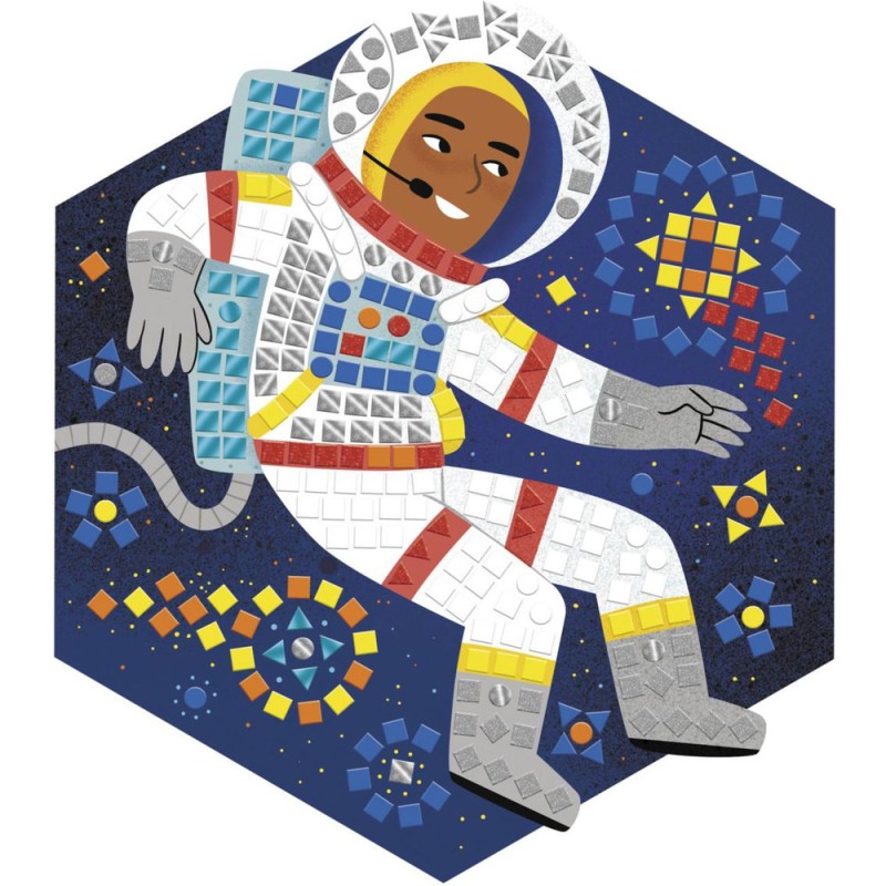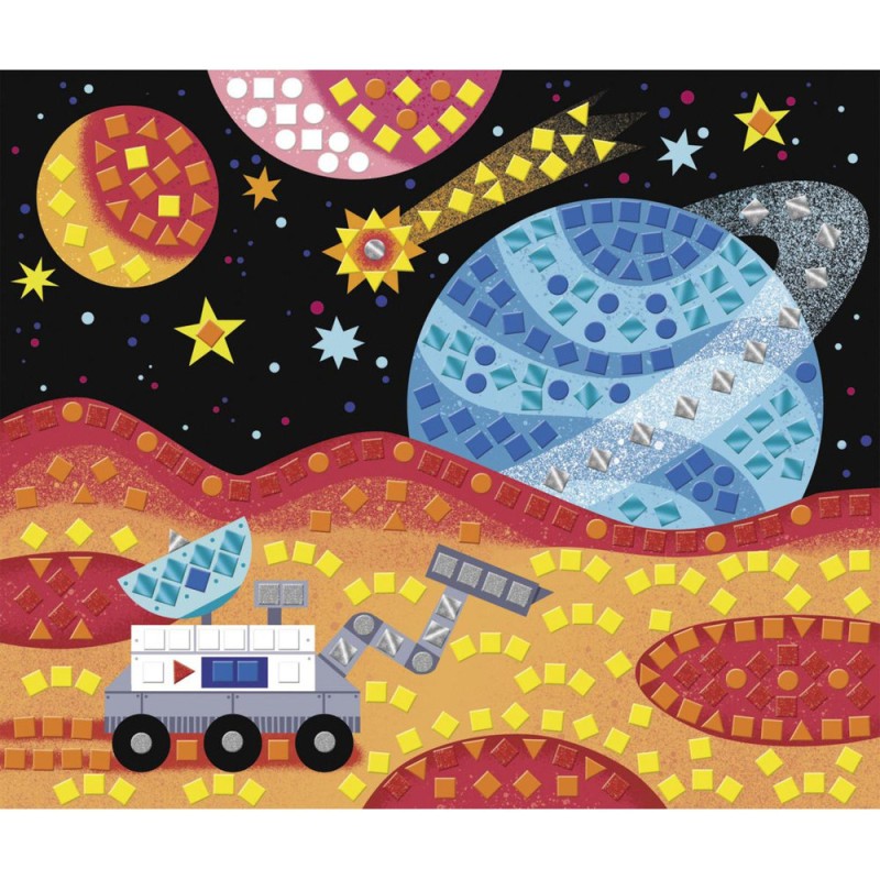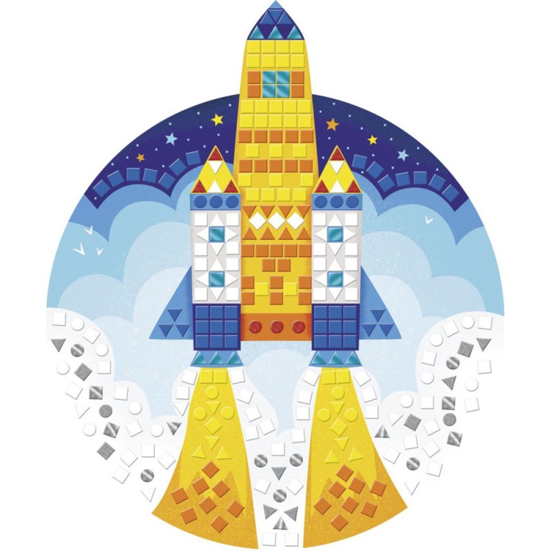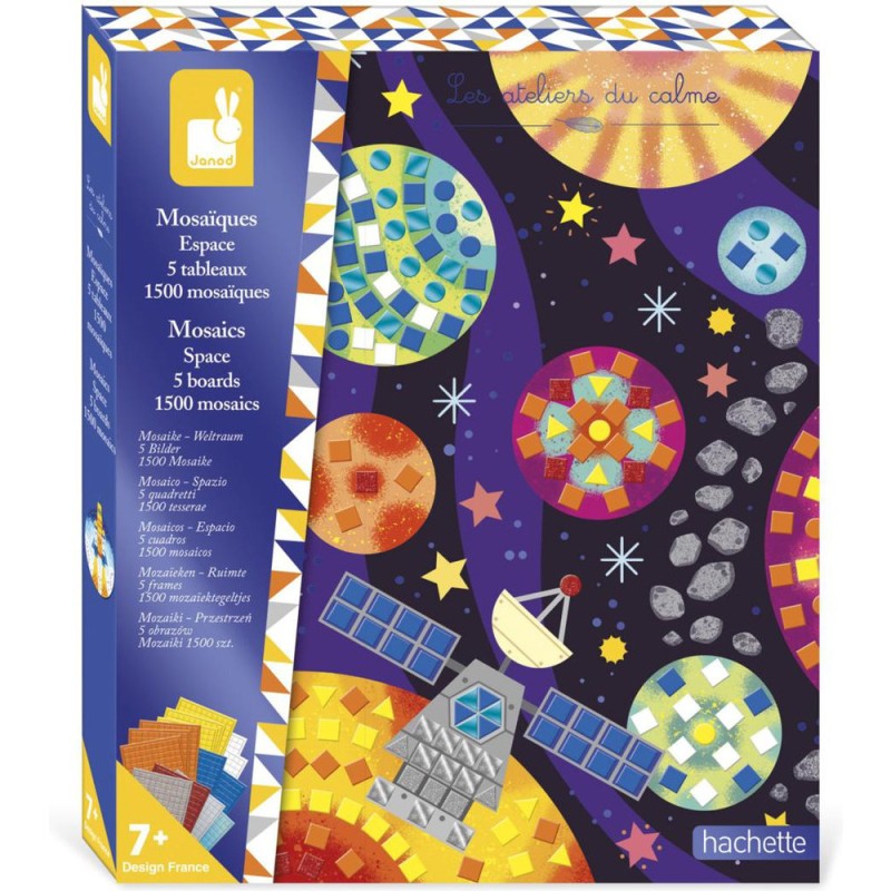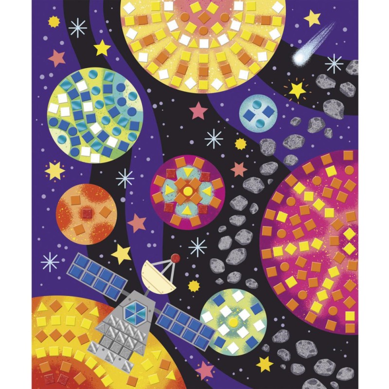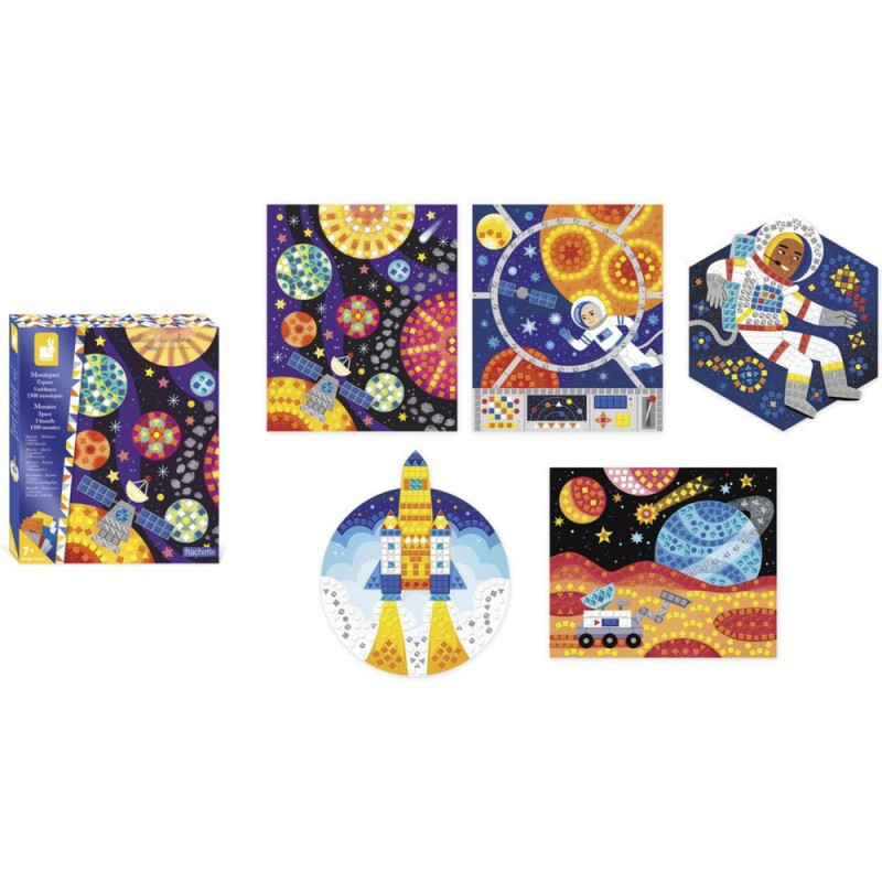 3, 2, 1, mise à feu ! Ce kit créatif sur le thème de l'espace invite les enfants à partir de 7 ans à compléter 5 tableaux de mosaïques : une activité qui développe la concentration et la motricité des petits. 14 planches sont incluses dans ce coffret, soit plus de 1550 mosaïques au total ! Pailletées, métallisées ou mat, elles donnent du relief aux réalisations des enfants et leur permettent de laisser parler leur créativité. Les 5 tableaux qui composent ce loisir créatif sont de diverses tailles et formes (rond, hexagone, format paysage ou portrait), pour une activité bricolage sans cesse renouvelée ! Il faudra compter 3 heures environ pour compléter tous les tableaux. Les fans d'astronautes seront ravis : fusées, satellites et planètes mystérieuses sont à orner de mosaïques, prêts à briller ! Avec ce coffret créatif, même les plus grands profitent d'une activité manuelle dans le calme et développent leur sens artistique. Un livret d'instructions est inclus pour reproduire les modèles proposés : résultat garanti pour nos petits artistes ! Ce kit créatif mosaïques est issu de la collection Les Ateliers du Calme, une gamme proposant des activités créatives aux enfants permettant de se concentrer et de se relaxer.