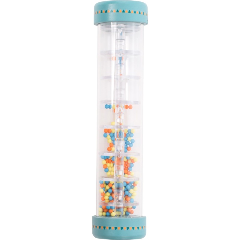 Un classique des jouets d'éveil qui est une forme de stimulation visuelle et auditive pour votre petit garçon ou votre petite fille. En retournant le baton, de petites billes tombent et génèrent un bruit semblable à celui de la pluie.