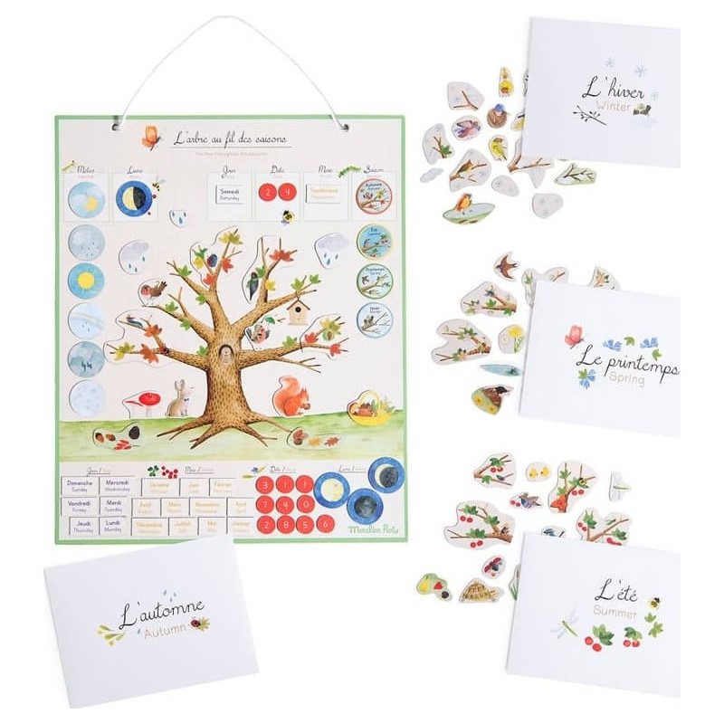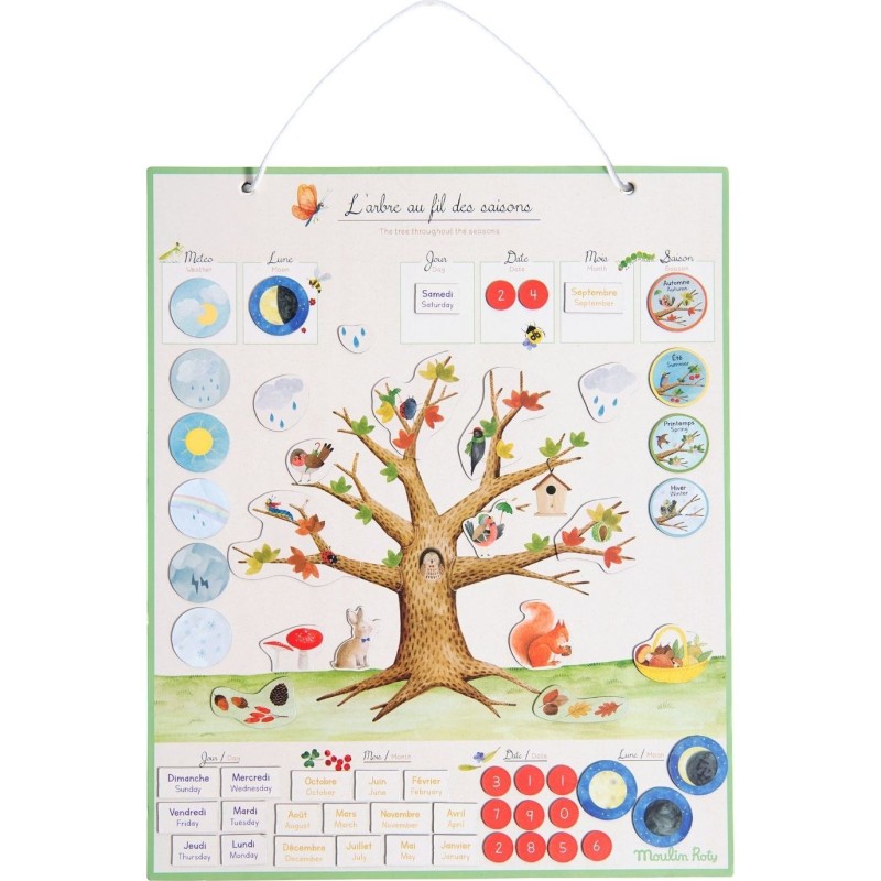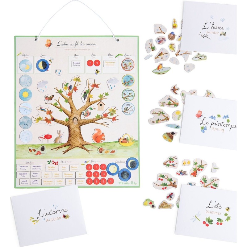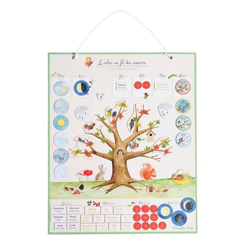 Le semainier magnétique pour enfant 4 saisons Moulin Roty comprend plus de 100 magnets pour se repérer dans le temps (date, météo, lune) et apprendre les saisons en habillant l'arbre illustré au fil de l'année.