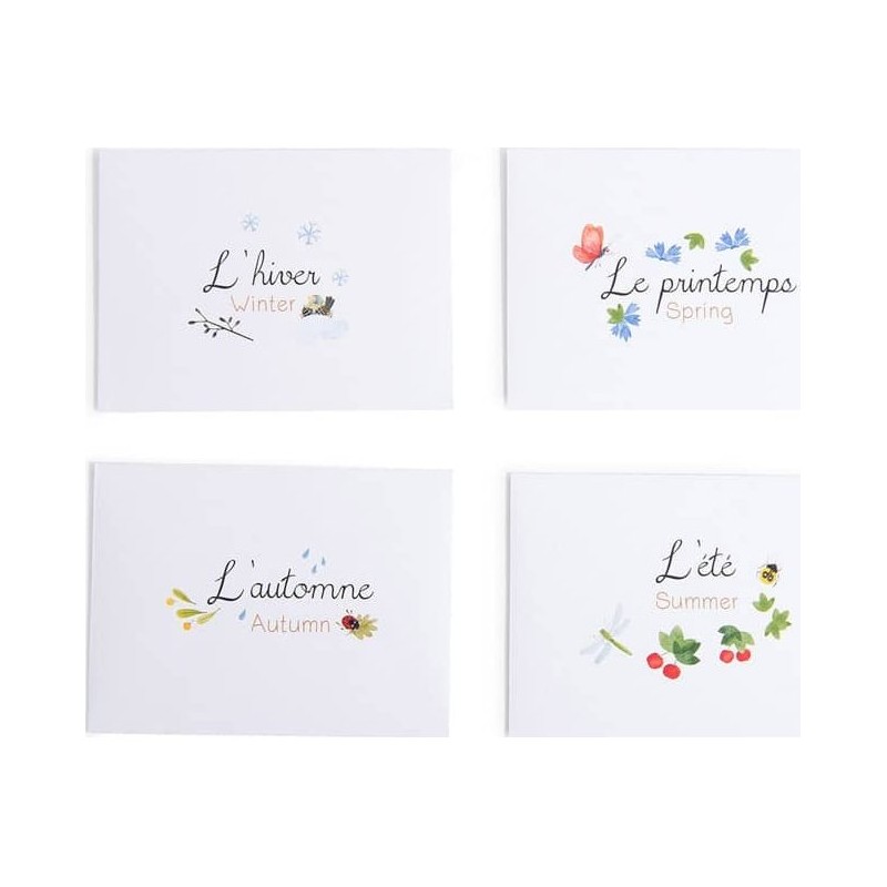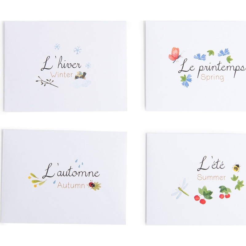 Il comprend aussi 4 enveloppes pour ranger chaque saison. Grâce à ce calendrier riche en détails, votre enfant se familiarisera avec la notion du temps qui passe et apprendra de nouveaux mots, aussi bien en français qu'en anglais !