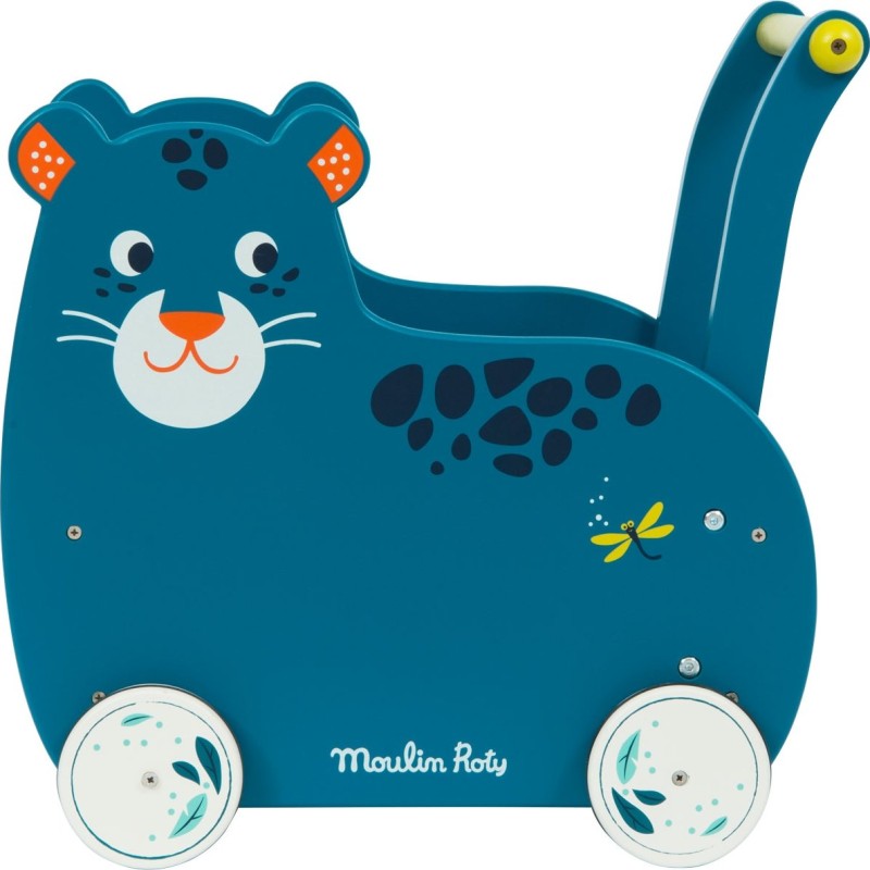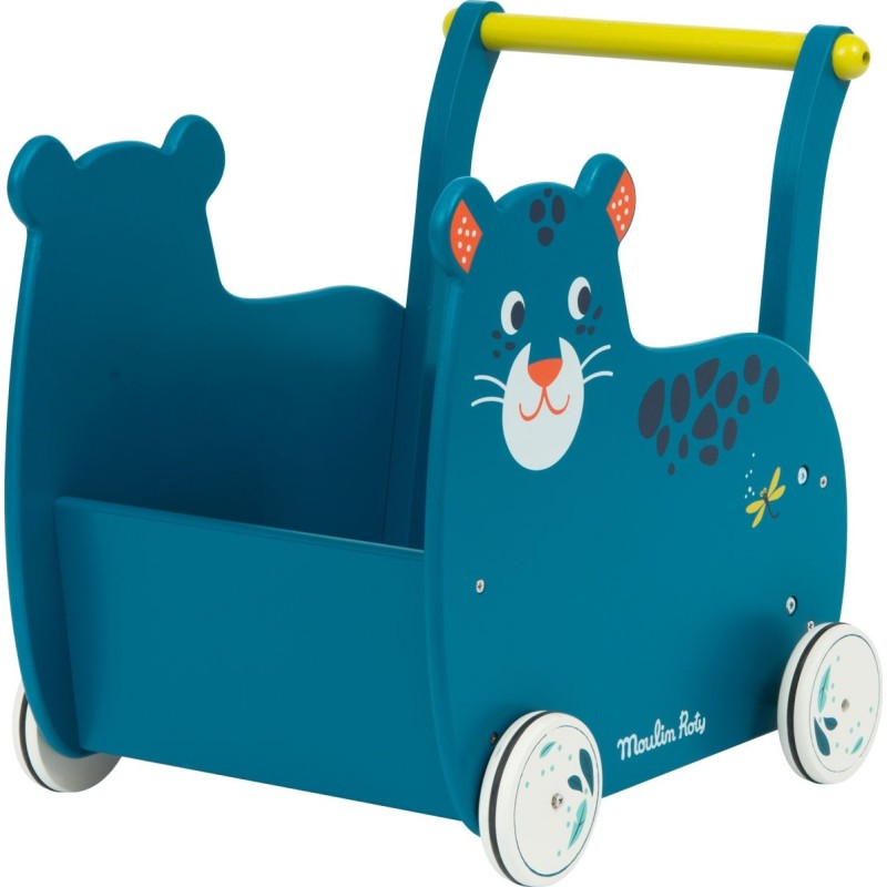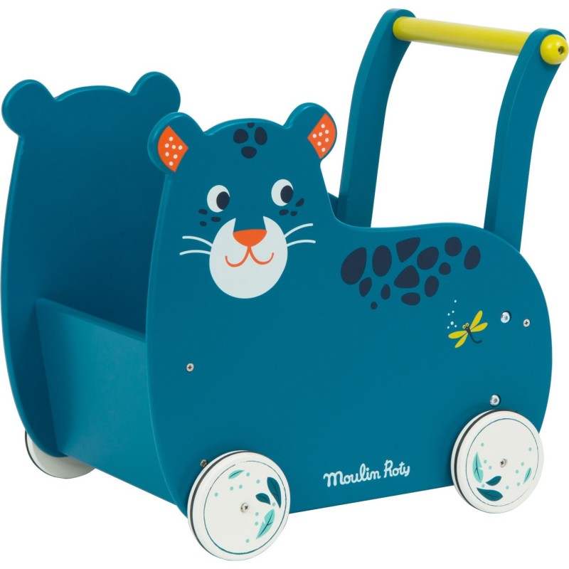 Ce beau chariot de marche en bois peint "Dans la Jungle", aux formes rondes, est illustré à l'effigie de la belle et gracieuse panthère Zimba, aux couleurs très tendance.
